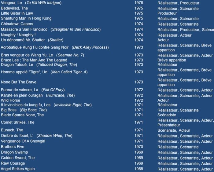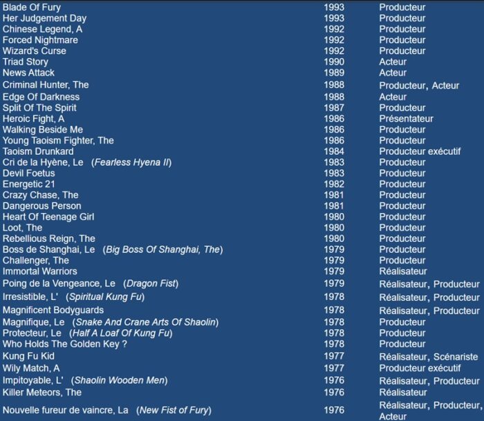 Après quelques entourloupes avec son dernier protégé, Lo Wei se retire du monde du cinéma, laissant derrière lui quelques noms d’acteurs illustres qui ont marqué à jamais l’histoire cinématographique de Hong Kong.