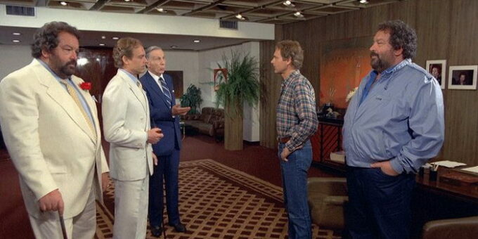 Très vite, on va se rendre compte que le scénario ne va être prétexte qu’à enchainer des situations bien absurdes dans lesquelles nos deux comparses vont s’éclater à incarner un rôle dans un rôle. Attention les Dégâts est beaucoup plus axé « comédie » que beaucoup de leurs bobines. Non pas qu’elles ne soient pas comiques, bien au contraire, mais ici, les gags vont s’enchainer à très grande vitesse. C’est un peu Bud Spencer et Terence Hill en vacances, et ils s’éclatent. C’est aussi peut-être ce qui fait que les fans du duo sont divisés à propos de ce film. Car du coup, il n’y a pas vraiment de cohérence dans leurs aventures. C’est quiproquo sur quiproquo et le film en devient presque un cartoon live. C’est parfois absurde, souvent burlesque, avec toujours les codes de leurs films (les gros repas, la destruction de bar, un chef des sbires ennemis très charismatique, un thème musical simple qui reste longtemps en tête, et une bonne humeur communicative). C’est vrai que plusieurs scènes ne servent à rien (celle chez le psy, le rendez-vous avec la demoiselle), mais au final, qu’importe, car ça marche. Certains gags sont à mourir de rire, juste que dans les grosses bagarres. Elles ne sont certes pas nombreuses, c’est d’ailleurs ce qui est souvent reproché au film, deux en tout et pour tout si on ne prend pas en compte celle de 30 secondes contre les motards, mais elles restent malgré tout dans le ton de ce qu’on espère voir quand on se lance dans un Bud Spencer et Terence Hill. Les cascadeurs se lâchent complètement (on reconnait certains habitués) et la baston finale a un côté « inédit » puisque les 2 « clones » se mêlent à l’histoire (même s’ils ne savent pas se battre). Oui, Un Bud Spencer et un Terence Hill, ça va, mais deux Bud Spencer et Deux Terence Hill, attention les dégâts. Il est à noter que les scènes où les quatre personnages sont dans la même pièce sont très réussis pour l’époque.