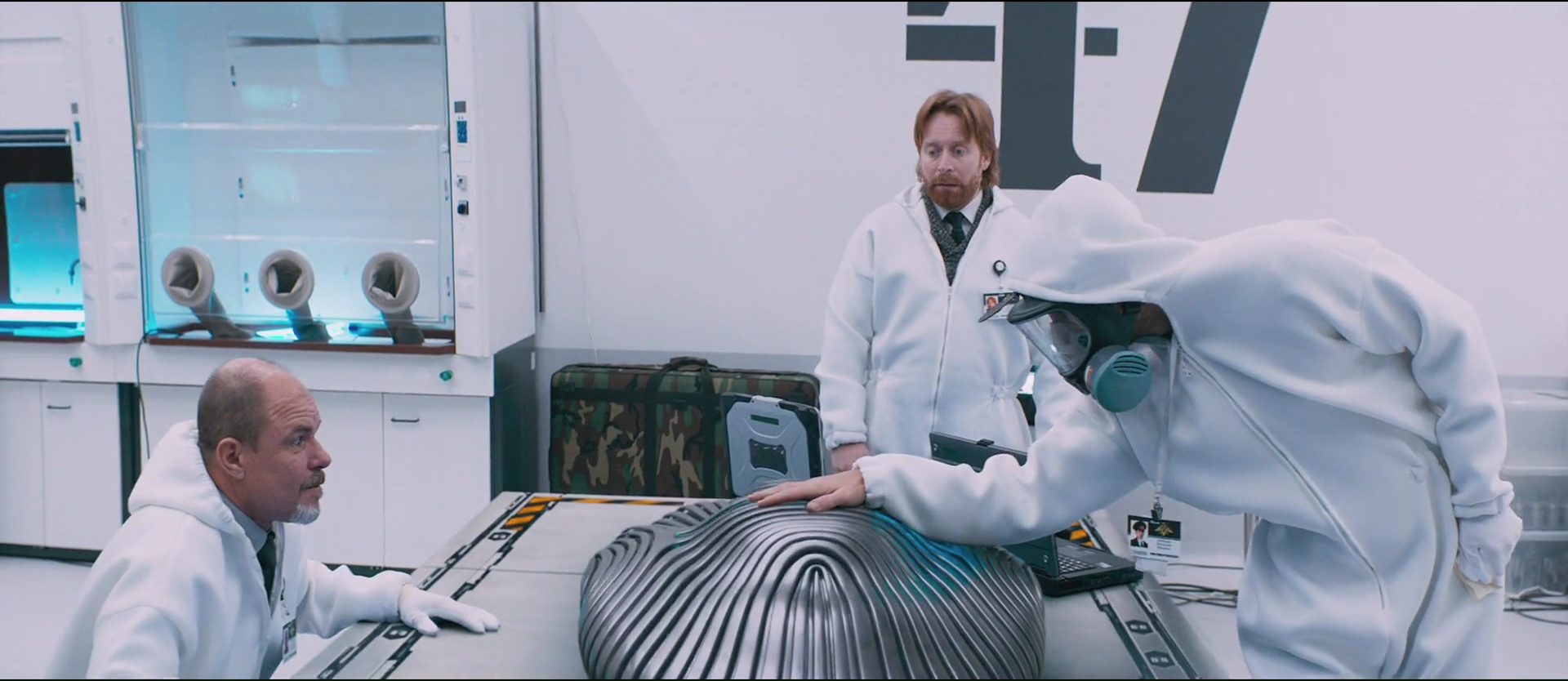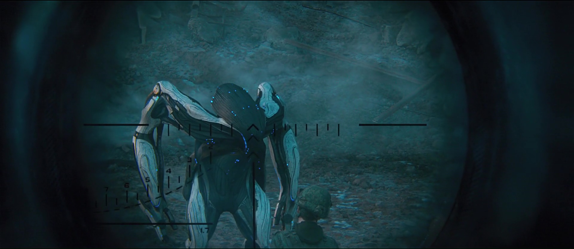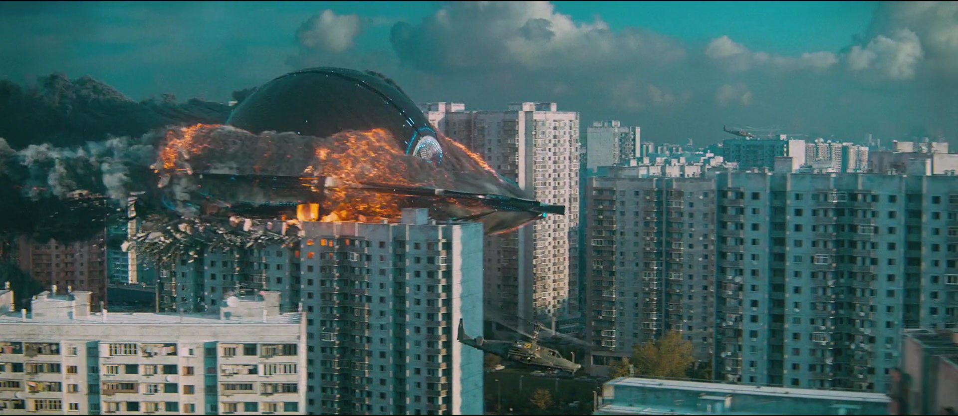 Premier bon point déjà dit, visuellement, ça a clairement de la gueule. Les nombreux CGI fonctionnent et impressionnent, comme lors du crash du vaisseau (même si la musique choisie pour la scène laisse à désirer), la mise en scène est sobre et agréable à l’œil, tout comme la photographie. On aura même droit à quelques bien beaux mouvements de caméra lors de certaines scènes, notamment lors d’une scène musclée sur la fin. Et si les CGI sont réussis, prouvant au final que la Russie maitrise plutôt bien cet aspect sans un budget monstre, le film se fait plutôt original dans son design. Le design du vaisseau et également des extra-terrestres sont en effet originaux, avec des formes harmonieuses et souvent circulaires. Si on révèle un peu trop vite pour les besoins de l’histoire que les fameux aliens, et bien, ce sont en fait des humanoïdes portant une combinaison et qu’ils sont donc finalement très proches de nous (ça aide pour la direction de l’histoire, mais aussi pour ne pas faire exploser le budget), il faut saluer ce choix visuel qui donne une certaine identité au métrage. En tout cas, un vaisseau circulaire d’une telle manière, cela rappelle bien plus le noyau dans Event Horizon que les nombreux vaisseaux de ce genre de métrage. Techniquement, c’est du tout bon donc. Scénaristiquement, si c’est très classique, on ne peut pas nier, comme le réalisateur le dit, la métaphore avec des événements réels. Ce vaisseau étranger, le peuple qui se rebelle et veut éliminer pour une mauvaise raison ce qu’ils voient comme une menace, ce n’est pas nouveau, tout simplement car si l’on remplace la menace venue de l’espace par un autre élément (un étranger, un émigré, ce que vous voulez), ce genre d’histoires peuple notre propre culture.