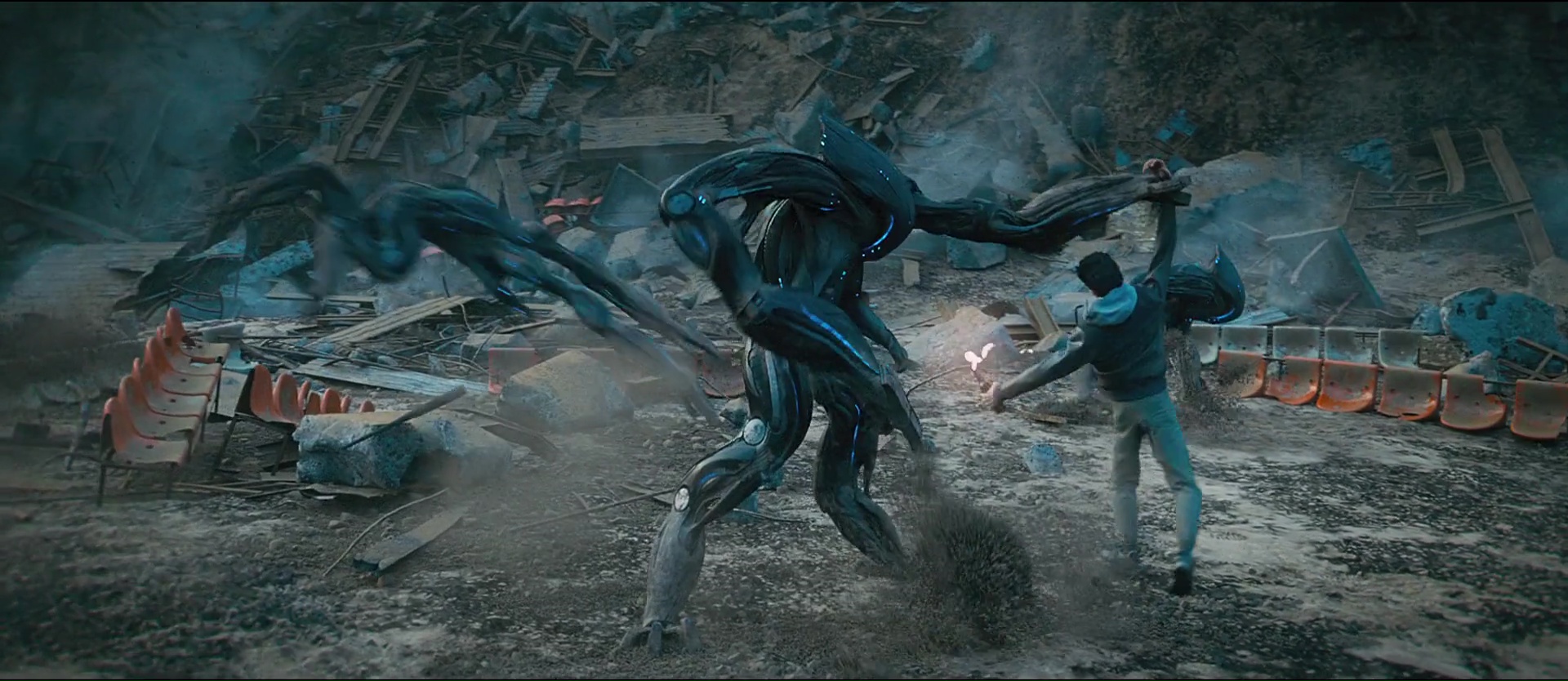 Après tout, déjà V dans les années 80, c’était une métaphore de la seconde guerre mondiale, et donc, de l’invasion nazi. Non, ce qu’il faudra accepter pour voir et apprécier le métrage, ce sera finalement son ton visant un très large public. On aura donc une héroïne adolescente, avec son petit copain, ses dilemmes, ses différents avec son père, militaire, ses affaires de cœur. Alors on ne tombe pas dans le truc mielleux qui s’éternise dessus comme dans certaines sagas récentes US (Divergent ? Hunger Games ?), mais il faut le souligner car cela reste dans le cœur du métrage puisque la jeune femme, Yuliya, va s’attacher à cet homme venu de l’espace, et la suite, on la devine clairement. Dans le même ordre d’idées finalement, voir ce visiteur venu d’ailleurs un peu par accident découvrir notre culture, tenter de s’adapter, et faire parfois quelques gaffes, comment ne pas penser finalement au cinéma de Spielberg où les envahisseurs ne sont pas forcément méchants (Rencontres du Troisième Type) ou tout simplement à Starman de John Carpenter, avec lequel le métrage à pas mal de points communs. Sauf qu’au lieu de la subtilité et de personnages matures, on se retrouve avec un film plus grand spectacle et des personnages plus jeunes. Reste que quelques petits éléments du scénario viennent donner une certaine logique aux événements, au lieu de le faire bêtement tomber dans la jolie histoire forcée d’attirance entre deux êtres différents. Des éléments qui rendent donc plutôt crédible une histoire simple et déjà vue. Dommage par contre que certains éléments, notamment la technologie alien, ne soient pas si exploitée que ça dans le film. Peut-être dans la suite ?