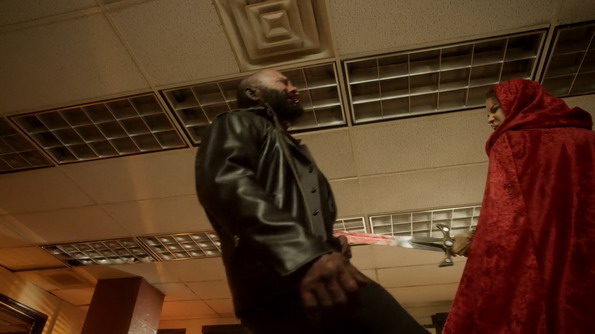 D’entrée de jeu, Avengers Grimm trouve un subterfuge pour envoyer ses différents protagonistes dans notre monde. Parce que oui, vous comprenez, les effets spéciaux en images de synthèse pour les décors, ça coute cher, et nous, on a pas de pognon. Alors messieurs de chez The Asylum, je vous remercie pour ça. Ca épargne un peu nos yeux de luxations et autres entorses visuelles qui auraient pu subir moult fonds verts bien dégueulasses de décors d’heroic fantasy bas de gamme. Car le seul présent en début de film a de quoi faire pleurer du sang bon nombre de gens qui n’auraient pas été préparés à la chose. Mais comme il faut tout de même essayer d’être un minimum impressionnant, ou tout du moins en donner l’illusion, on va essayer quelques esbroufes visuelles. On nous colle donc des ralentis outranciers sur les scènes d’action, histoire de cacher la misère des chorégraphies et de tenter, vainement hein, de donner un semblant d’intensité à cette affaire, même lorsque c’est juste pour donner un côté badass à notre groupe de pimbêches qui marchent juste dans la rue. Oui, on ose tout chez The Asylum, et on se carre complètement de l’invraisemblance de ce qu’on jette violemment à la gueule du spectateur un peu fou qui aurait osé tenter l’expérience d’Avengers Grimm. Nos princesses karateka arrivent dans un monde rempli de technologie, mais rien ne les étonne. Blanche-Neige sait même déjà conduire ! Blanche Neige sort tour à tour son arc et son épée alors que le plan d’avant, elle n’avait absolument rien sur elle. Mais où les avais-tu caché petite coquine ? DTC répondront les plus poètes d’entre nous.