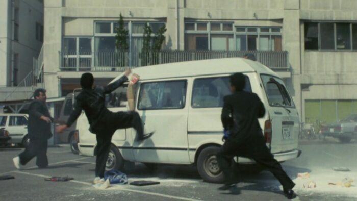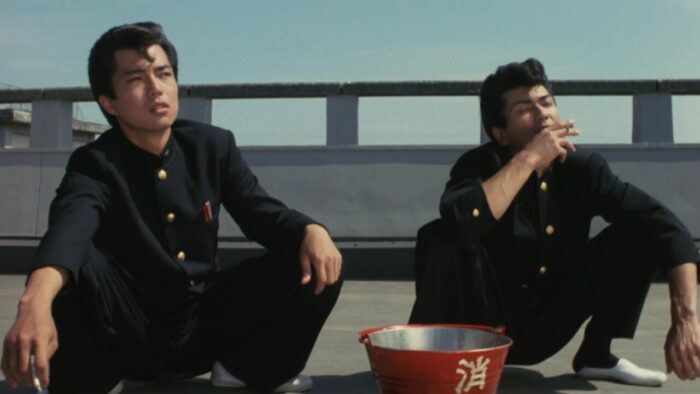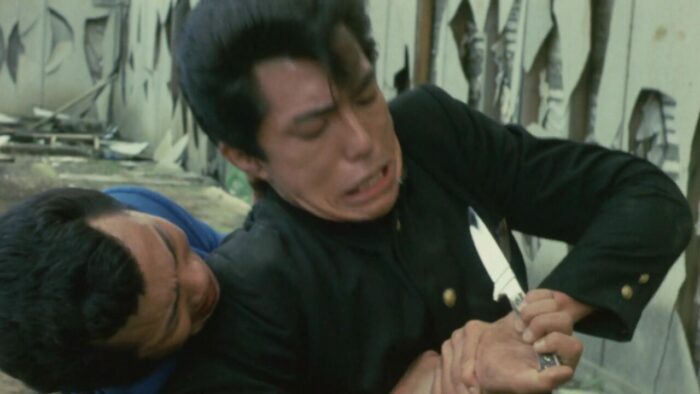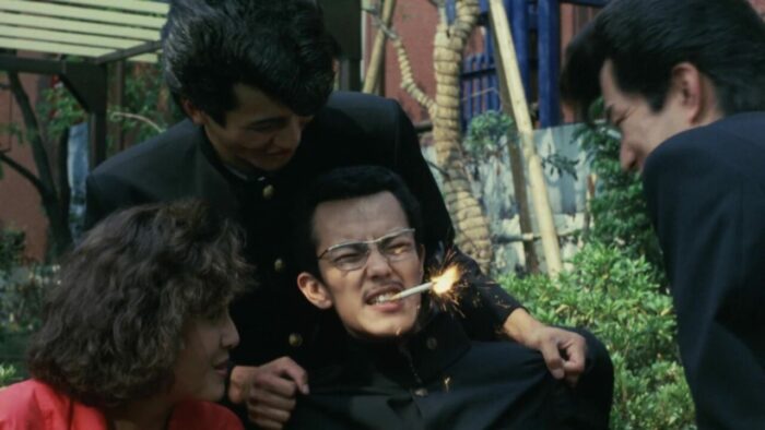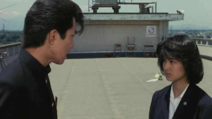 Ça ne rendait pas le film mauvais, loin de là, mais on pouvait regretter une formule pareille pour un film de cinéma, avec forcément, moins de temps pour l’intrigue par la suite lorsqu’elle arrive enfin, et moins d’impact. Ce second opus corrige donc ce défaut, sans totalement le faire disparaître. Le début sera toujours léger, enchainera toujours les situations n’ayant pas toujours de liens entre elles, entre éléments comiques et bastons entre étudiants longtemps avant Crows Zero (et finalement, en plus convaincant, le ton léger du film faisant passer la pilule là où dans la trilogie Crows, ça se prend terriblement au sérieux), mais cette partie introduit déjà certains éléments qui auront leur importance pour la suite, avec cette rivalité entre les deux écoles. Pour le coup, scénaristiquement parlant, c’est vraiment comme Crows Zero 2, 25 ans avant, et avec humour, et pour le coup, des personnages attachants. On retrouve bien entendu dans les rôles principaux Nakamura Tôru et Shimizu Kôjiro, Tôru et Hiroshi donc, délinquants, appréciés des autres élèves, adulés par certains même. Rapidement, leur amie Izumi (Nakayama Miho) revient les voir et annonce qu’elle revient dans le même lycée, quelques gags renvoient au premier opus et offrent un effet miroir sympathique, et le tout se suit avec plaisir, surtout que le rythme est endiablé. Et rapidement, les « antagonistes » présentés au détour de quelques scènes comiques dans la première partie deviennent plus persistants, et de véritables antagonistes, faisant presque éclater une guerre entre deux écoles, après que Tôru et Hiroshi ne se soient faits humiliés, tabassés et volés leur pantalon, rien que ça.