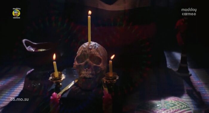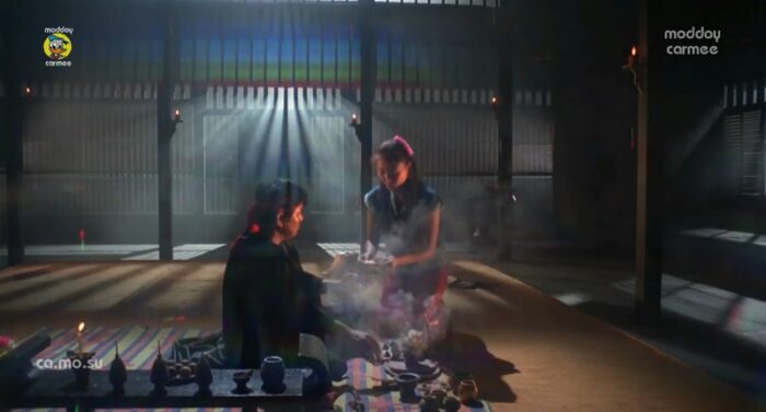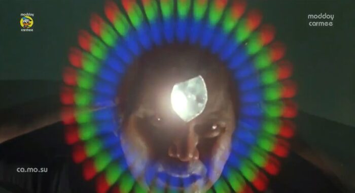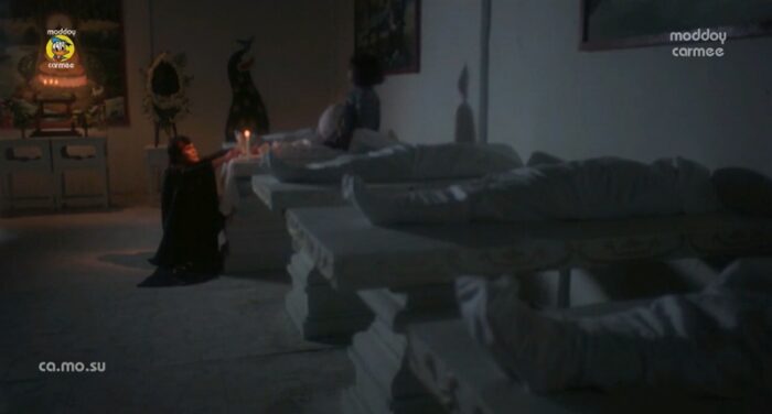 L’action de Bewitched se déroule en quasi intégralité à Bangkok. La ville nous est présentée sous différents aspects : carte postale – de longs plans touristiques, pas très éloignés de simples stock shots (mention spéciale à l’affiche thaïlandaise géante de Star Wars !) -, spiritualité – temples bouddhistes et sorcellerie -, et vice – des prostituées alignées sur des estrades avec chacune un numéro pour être « sélectionnée » par le client -. Mais ce n’est pas ce qui intéresse véritablement Kuei Chih Hung. Lui, ce sont les affrontements à base de sortilèges, si possible entre un moine et un sorcier. Il déborde alors d’imagination et le spectateur assiste à un grand délire visuel et verbal. Pour les yeux, il aura droit à de grands pots remplis de curieuses mixtures (sang, tripes, cerveaux, viscères, le tout agrémenté de quelques fœtus), des déjections de cadavres, des jets de lumière multicolores, de la lévitation, des destructions, d’effrayants instruments, des festins d’asticots, etc. Pour les oreilles, hormis les cris, il s’amusera à noter les recettes personnelles du moine et du sorcier : nommées en voix off, elles sont ensuite détaillées ingrédient par ingrédient, préparation et effets finaux inclus. Un régal ! Bien entendu, le réalisateur exploite complètement son matériau et insiste chaque fois que possible sur le côté nauséeux ou sordide.
