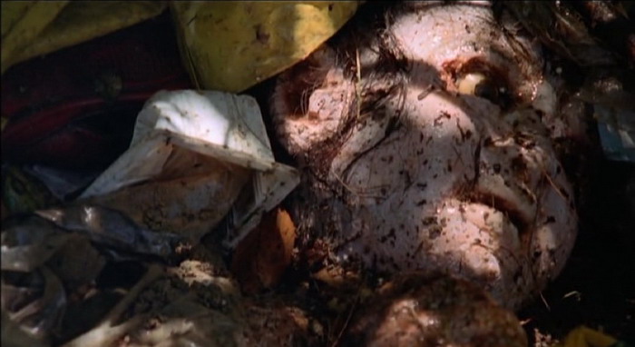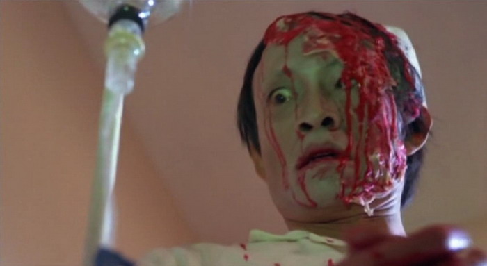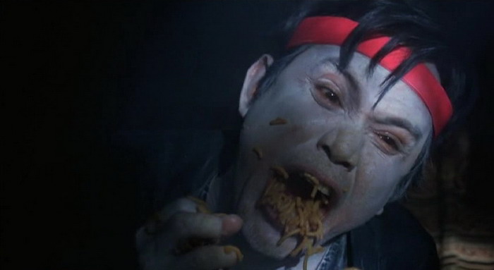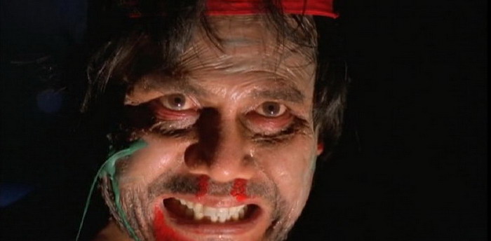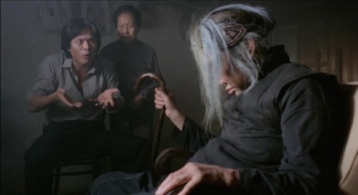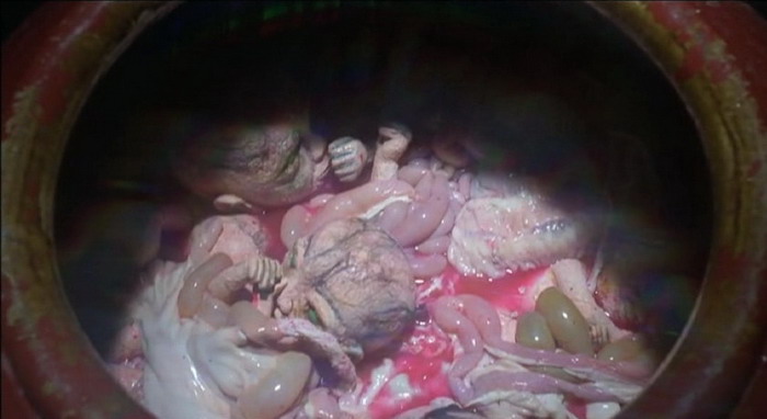 L’horreur joue sur plusieurs tableaux. D’un côté, on a cette atmosphère très particulière, avec une lumière crue, ce refus de filmer la beauté de la Thaïlande, ou encore cette bande son qui sait se faire inquiétante. Bewitched met parfois mal à l’aise sans même montrer quoi que ce soit. Mais aussi quand il décide de montrer les choses avec des rituels de sorcellerie qui sont filmés frontalement, sans détour. On y voit longuement des sorciers préparer et exécuter leurs méfaits et/ou rites protecteurs. On y voit toute la panoplie sacrificielle, que ce soit des poules et des serpents dont on va récolter le sang, des milliers de vers vivants qui vont être ingurgités, ou encore des mélanges bien dégueux comme cette marmite remplie de sang, de viscères et de bébés décédés qui va être ingurgitée par un des sorciers. Le film prend un malin plaisir à nous montrer les conséquences sales et dégoulinantes, comme ce jeune enfant dévorant un foie ensanglanté cru, ces corps pourrissants assez dérangeants, ces divers fluides colorés s’échappant des corps, ces personnages qui s’automutilent, … le tout filmé sans aucune distance ni ironie, bien frontalement. Certaines de ces scènes sont longues, s’éternisent, comme si Kuei Chih-Hung voulait forcer le spectateur à voir ce qu’il ne souhaitait en fait pas voir, avec cette impression qu’il voulait qu’on assiste à ces rituels comme si on était juste devant eux. Les effets pratiques sont d’ailleurs plutôt bons pour l’époque, on sent qu’un grand soin y a été apporté. Les scènes chocs du film sont savamment distillés dans les deux premières parties, avant de devenir monnaie courante dans la dernière. Pourtant, bien qu’il ne faille pas être trop sensible de l’estomac, Bewitched arrive sans aucun souci à divertir car ces éléments de magie noire en deviennent presque fascinants dans la façon dont ils sont mis en scène et le duel à distance entre les deux sorciers reste gravé dans les mémoires tant Kuei Chih-Hung a tout compris à comment cela devait être mis en scène, en ne tombant jamais dans le confortable, en gardant coute que coute cette rugosité qui caractérise le film.