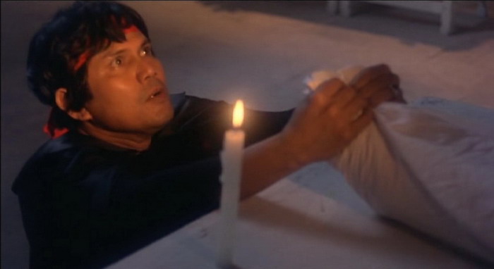 L’histoire du film est très simple : un homme a assassiné sa fille et est jugé : ça sera la peine de mort. Mais alors qu’il est interrogé par la Police, on comprend comment il en est venu à un tel acte. Lors d’un voyage en Thaïlande, il fréquente d’une demoiselle sur place qui tombe amoureuse de lui, alors qu’il est marié. Lorsqu’il décide qu’il n’a plus envie de s’amuser avec la demoiselle, celle-ci fait appel à un puissant sorcier pour qu’il lui jette une malédiction. Cette malédiction va lui donner l’impression que ses proches lui en veulent, dont sa jeune fille qu’il va donc finir par tuer et enterrer dans la nature. Le policier va se rendre en Thaïlande pour essayer de comprendre cette histoire et va lui aussi se retrouver confronté à cette magie noire. Selon la légende, et ce que dit le générique, celui qui incarne le puissant sorcier du film nommé Magusu aurait été incarné par un véritable sorcier malaisien tristement célèbre, Hussein Hassan. Voilà pour la petite anecdote mais revenons-en au film qui mérite qu’on y jette un œil à plus d’un titre. Bewitched est clairement découpé en trois parties. La première mise sur l’érotisme, avec quelques demoiselles dénudées qui gambadent seins nus devant la caméra. La deuxième se concentre sur l’enquête, avec le personnage du policier interprété par Melvin Wong (Une Flic de Choc), entre interrogatoire et prise de renseignements sur le terrain. Enfin, la dernière partie va jouer à fond la carte de la magie noire comme Hong Kong en avait le secret à cette période. Le première chose qui frappe dans Bewitched, c’est à quel point tout est fait pour que l’ensemble soit le plus réaliste possible, à la limite parfois du documentaire. Rien n’est enjolivé, l’ambiance y est moite, sombre, grouillante, et à aucun moment le film ne cherche à rassurer le spectateur. On est rapidement plongé dans une descente vers l’irrationnel, au même titre que l’enquête en elle-même et cet enquêteur cartésien dont les certitudes vont être mises à mal par les évènements auxquels il va être confronté.