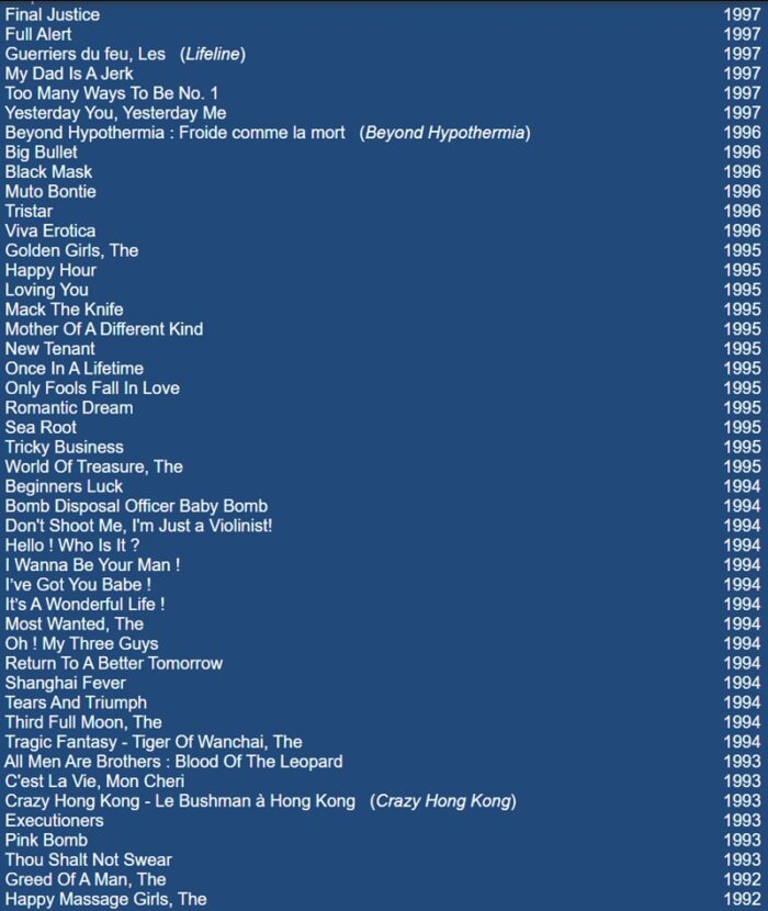 On peut également retrouver Wu Chien-lien aux côtés de Chow Yun-fat dans Treasure Hunt. En France, on a vu cette pulpeuse actrice que dans le très spécial Arnaqueur de Hong Kong (la chinoise qu’il rencontre en voyage après la mort atroce de sa femme). Cette fille a vraiment du Chien !