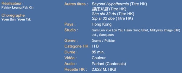 Beyond Hypothermia est un film à la réalisation impressionnante, visuellement encore très moderne, mais dont le traitement franchement brouillon et l’écriture approximative l’empêchent d’accéder a statut d’œuvre mémorable. Reste à espérer que Patrick Leung décide un jour de rectifier le tir en s’octroyant les services d’un scénariste décidé à raconter une bonne histoire pour enfin nous livrer son polar définitif !