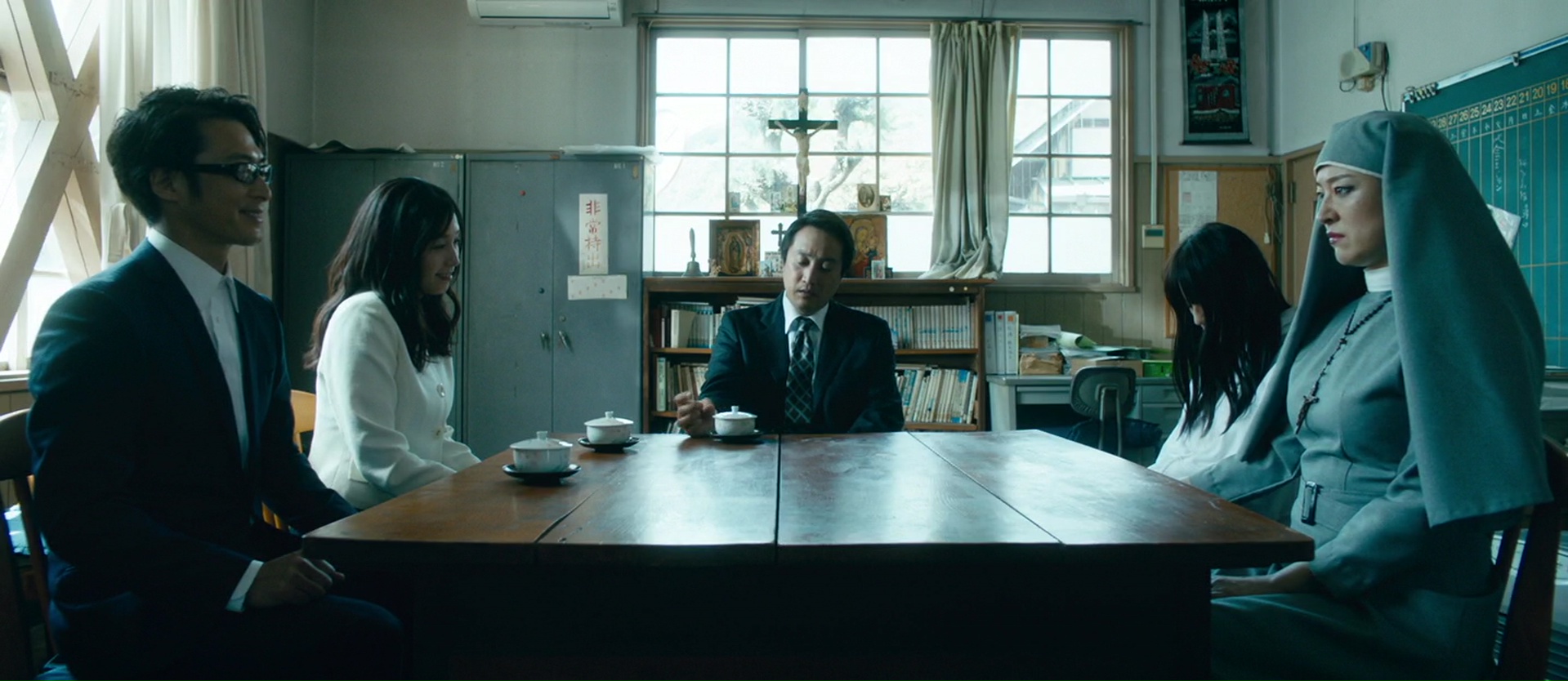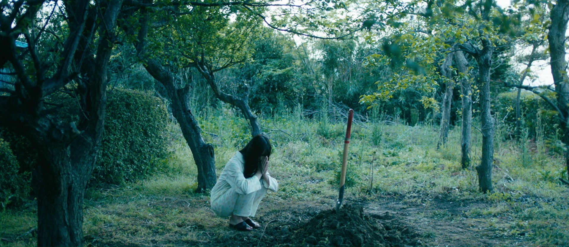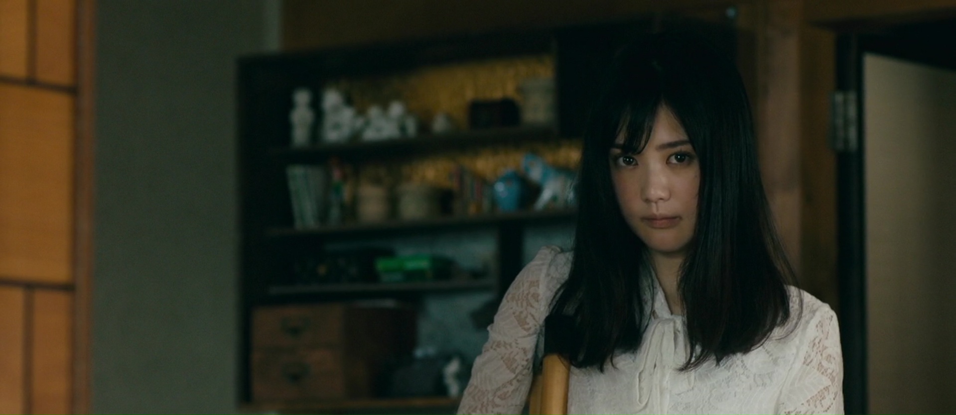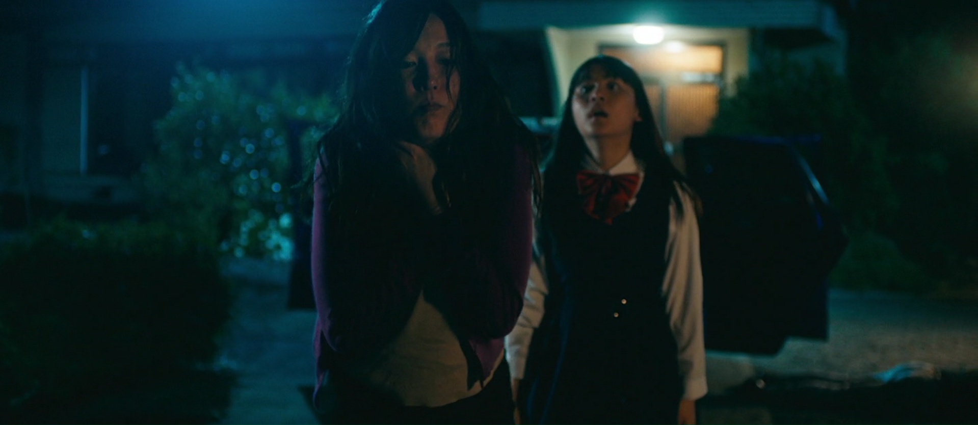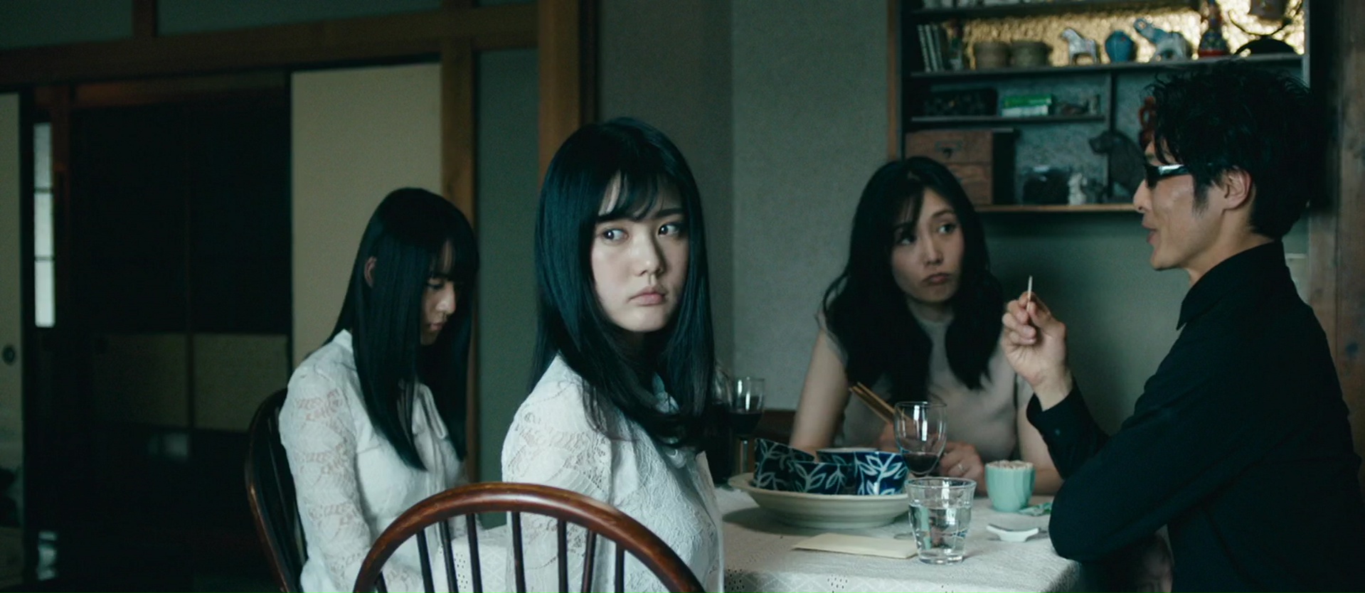 Alors certes, je m’attendais à un métrage fauché tourné un peu n’importe comment, et je me suis retrouvé dés la première scène avec une œuvre filmée proprement, caméra sur pieds quasi intégralement, avec des cadrages léchés, une jolie photographie, et une envie de poser une ambiance qui devient lourde au fur et à mesure des minutes sans que l’on sache les tenants et les aboutissants de la dite histoire. Du bon boulot donc. Oui, dés l’ouverture dans l’orphelinat, qui semble presque abandonné, avec cette jeune femme, Mei (Asakawa Nana) sifflotant le boléro de Ravel sur sa balançoire, avant de continuer à l’intérieur avec une discussion entre le directeur de l’orphelinat, une bonne sœur et le couple Ueda, venu en ses lieux pour adopter Mei, une ambiance se pose, quelque chose de lourd se trame, sans que l’on sache quoi. Les silences sont parfois lourds, le couple Ueda passe son temps à sourire, et une étrangeté se dégage de ces quelques moments. Alors, le spectateur non habitué lui pourra tiquer sur certains éléments, notamment le jeu des acteurs, absolument pas mauvais, mais qui a tendance à en faire un peu trop sur certaines émotions. Beaucoup d’éléments sont accentués, volontairement. Est-ce pour faire ressortir encore une fois l’étrangeté ? Ou une volonté un peu plus « manga » ? Impossible à dire, mais Black Maiden n’adapte rien, c’est là un scénario original du réalisateur. Les scènes s’enchaînement, et si l’amitié qui va lier Mei à Rana (Kita Kana), les deux orphelines de la famille Ueda est plutôt douce et fonctionne naturellement à l’écran, l’étrangeté elle ne quittera jamais longtemps le récit. Quelques apparitions étranges en arrière plan (mais sans aucun jumpscares), des parents qui passent leur temps à sourire, c’est déjà étrange. Mais si l’on ajoute alors le voisinage au comportement grotesque, avec cette dame passant son temps à taper sur une poêle dehors en criant Hitogoroshi (Meurtrier), même en plein milieu de la nuit, venant alors envahir le métrage de manière sonore, nous indiquant sa présence quasi permanente, ça fonctionne vraiment très bien.