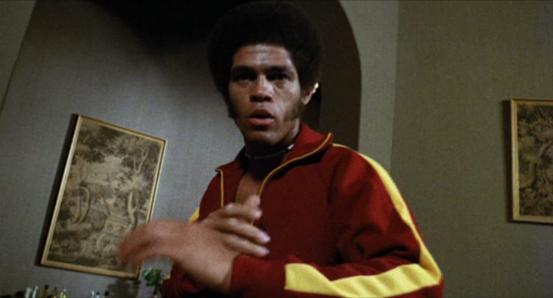 Car si l’on omet le reste, et ça peut être rude tant c’est chiant, Black Samuraï mise sur l’action et c’est là qu’est tout l’intérêt. Il ne faudra pas compter sur des bastons emballées avec le plus grand soin, ceci dit Jim Kelly est parfois bien mis en valeur et si il est un piètre acteur (à l‘image du reste du casting), il démontre ses capacités martiales et sa rapidité dans une succession de scènes d’action terriblement mauvaises mais si amusantes. Black Samuraï enchaîne les moments improbables, Jim Kelly défonce des nains, des indigènes sortis d’un bois, et même un vautour, un vrai. Ajoutez à cela un montage qui part en vrille, des faux raccord en pagaille dont certains trahissent l’ordre dans lequel le film a été tourné (et même l’heure de la journée), des figurants qui au choix manquent de se casser la gueule, sont hilares dans le fond, ou se demandent ce qu’ils foutent là et surtout quoi faire, et des plans qui défient la logique. A ce titre, comment ne pas rester admiratif face à un plan dont on ne verra rien car caché par la coupe afro d’un figurant qui se place pile devant la caméra. Ce genre de moments très cons mais très bons, Black Samuraï en est blindé avec le stealth kill le moins discret de l’histoire du cinéma, des déguisements dessinés par des gamins de maternelle, une scène où un mec fait une balade en jet-pack dans un moment qui, il faut le reconnaître, fait spectaculaire mais est tellement mal foutu que ça en devient risible, Jim Kelly qui sort un mini lance flamme de son slip, entre autres mésaventures qui trouvent un point d’orgue dans une baston finale entièrement redoublée en post prod, pour un résultat à s’en décrocher la mâchoire. Des scènes au potentiel nanar certain, mais qui paradoxalement se vivent aussi très bien au premier degré avec un petit sourire en coin puisqu’il ne faut pas oublier qu’avant toute chose, Black Samuraï est un pur film d’exploitation avec ce que ça apporte comme outrance et folie typique d’une époque révolue. Dans les deux cas, Black Samuraï est une curiosité à voir pour les amateurs de ce type de cinéma qui n’avait peur de rien, mais on ne va pas se mentir : quand il n’y a pas de bastons, il est difficile de garder les yeux ouverts sur la longueur.