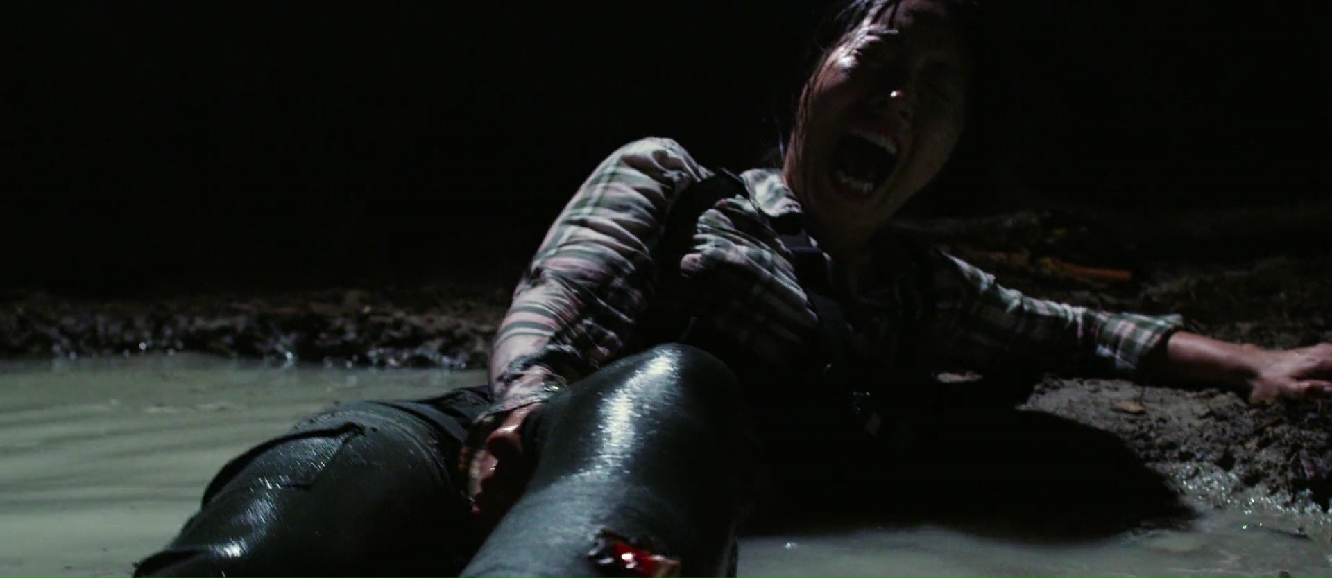 Le réalisateur ne change en tout cas aucunement son style ou sa feuille de route, le crocodile sera peu montré, sa présence sera souvent suggérée, par des mouvements dans l’eau, des sons, des possibles mouvements dans l’obscurité, ou tout simplement un mauvais pressentiment de la part des personnages. Mais justement, le premier souci du film viendra des personnages, et de son écriture. Car nous sommes bien d’accord pour dire que le genre est un genre très codifié, et souvent très minimaliste dans son scénario et son approche, se limitant très souvent à des huis clos, du moins chez le réalisateur. On ne demande donc pas une profondeur dans l’écriture du récit, mais des personnages crédibles, un peu futés, auxquels l’on peut s’identifier, et que l’on arrive à apprécier durant la durée du métrage, à savoir ici 1h38. Et à ce niveau, le métrage échoue. Déjà car les personnages se lancent à l’aventure alors qu’ils ne sont absolument pas préparés, et surtout car ils se lancent dans une grotte perdue au milieu de nul part alors que tous les signes sont là pour qu’ils ne descendent pas. Un couple de Japonais disparus dans les environs peu de temps avant et pas encore retrouvé (que l’on voit en scène d’ouverture se faire bouffer), un ouragan tropical en approche et qui risque donc de faire descendre dans la dite grotte un beau paquet de flotte… De plus, les personnages sont pour la plupart des novices. Un homme qui a trouvé la grotte mais n’est jamais descendu, un journaliste qui a l’habitude d’écrire ses papiers bien installé dans son hôtel, l’héroïne peut habituée au terrain, et sa pote qui est enceinte. Rajoutons que l’héroïne est un brin claustrophobe et vous avez là une bien belle équipe. Après, si il s’agissait d’une équipe qui n’a peur de rien, qui n’a aucun point faible, ça n’aurait sans doute pas été passionnant non plus, mais quand même. Si encore le film jouait bien sur l’efficacité et la tension, voilà que l’on pourrait pardonner. Sauf que là non plus ce n’est pas la folie.