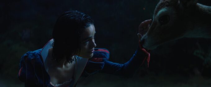 Déjà, évacuons certains points. Non, le film ne mérite pas 1.6/10 comme le montre sa moyenne imdb, faisant plus office de coup de poing pour faire passer un message à Disney. Le côté soi-disant woke du film, qui aurait cependant pu être atténué via le tournage additionnel, n’est pas le souci principal du film. Et ensuite, aussi détestable et ayant la grosse tête Rachel Zegler semble être, elle n’est pas le principal souci du film. En réalité, en termes d’acting, c’est sans doute celle qui s’en sort le mieux. Car la triste réalité, c’est simplement que c’est tout le reste qui cloche, et ce dès l’ouverture. Disney, il faudrait faire des choix. Soit vous faites des films d’animation avec des animaux, et bien, animés, soit vous faites des films lives et prenez de vrais animaux. Car là, chaque animal dans le film, que ce soit un écureuil, bambi, un lapin, un hérisson, tout quoi, tout est en CGI, avec des gros yeux qui font penser à l’animation Japonaise, dans un film qui se veut photoréaliste, et c’est sacrément moche. Pas du tout réaliste, jamais féérique, juste moche, et même en vrai par moment flippant. D’ailleurs, évacuons le plus gros éléphant dans la pièce, c’est le film en général qui est moche visuellement. Tout sonne faux, comme si l’intégralité du film avait été tourné sur un fond vert. Alors oui, il y a bien quelques scènes en forêt qui semblent avoir été tournées en forêt, mais souvent, tout paraît factice, même d’autres scènes en forêt. Si bien que oui, on a souvent l’impression de voir trois acteurs, réels, se débattre au milieu de tout le reste, en CGI. Visuellement donc, le film est plutôt une honte, surtout compte tenu du budget. Surtout quand parfois, la photographie se sent obligée d’y aller à fond en augmentant les couleurs, les contrastes, pour donner l’illusion d’un monde féérique, mais en réalité, ça ne fait que ressortir le côté factice de son univers. Au niveau des acteurs… Oui, Rachel Zegler est finalement sans doute celle qui s’en sort le mieux. Encore une fois, je ne juge que son interprétation et laisse tout préjugé ou prise de parole de l’actrice de côté.