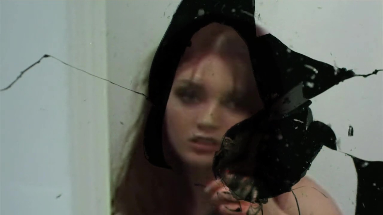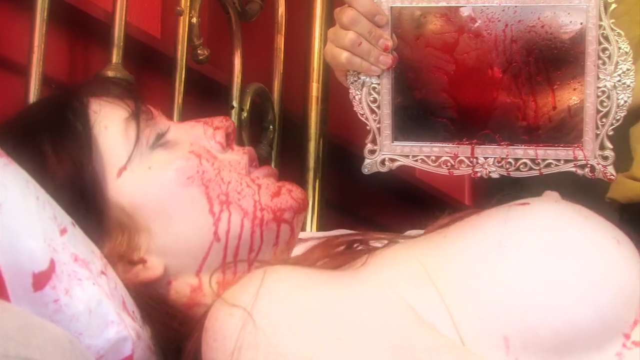 Scène 1 : scène lesbienne ! Ah oui, le sexe au cinéma donc… Malheureusement pour Mary, son mari est jaloux, et là où la plupart des hommes fantasment sur un plan avec deux filles, le mari débarque, et les tue toutes les deux. Les hommes étaient donc moins pervers en 1904. On aura droit à des giclées de sang numériques, un montage ultra cut, et un plan ultra méga cut sur une blessure (dommage, sans doute le plan le plus pro du film). L’histoire reprend alors de nos jours et, on s’en doute, la Mary tuée et bien c’est la légende de Bloody Mary, et si l’on dit son nom devant le miroir (Candyman, Can…. Ah non, Bloody Mary), et bien elle revient et tue tout le monde. Le film délocalise alors dans un studio (enfin, on verra l’extérieur du studio et 3 pièces vides) où une équipe vient tournée un clip musical. Occasion pour l’équipe, pour être sûr que Bloody Mary ai la durée d’un long métrage, de faire chanter l’acteur principal… sur une chanson… sur toute la durée de la chanson… en intro ET dans le final… donc facile 8 minutes de chanson. Donc bref, Veronica Ricci va revenir, tuer tout le monde, jusqu’à ce que notre héros brise la malédiction, et fin. Entre le début et la fin, ben des meurtres souvent hors champs, du sang sur les acteurs vite fait pour faire illusion, et Veronica Ricci qui se balade dans des tenues allant de la nudité intégrale à la mini jupe sans culotte en dessous. Subtil !
