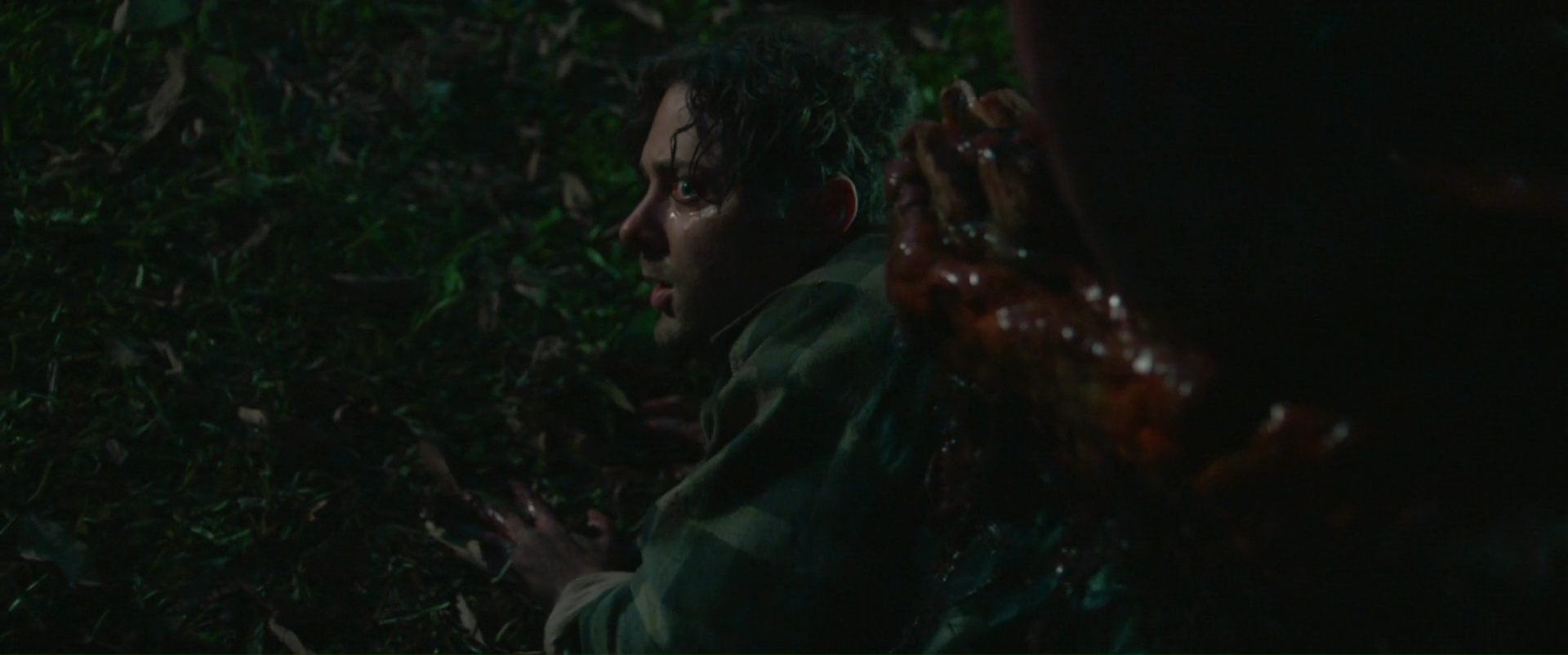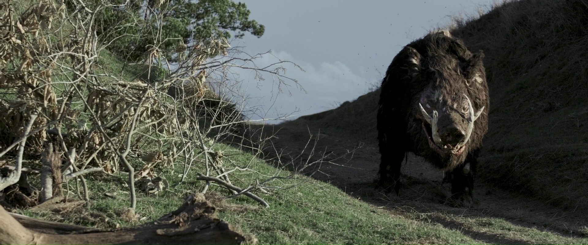 Bon, vous me direz, on ne demande pas à ce genre de métrages d’avoir un scénario ultra développé ou même des personnages dignes de Shakespeare. Non, on demande du gore, du rythme, et parfois il est vrai un visuel léché. Ce que Razorback avait, avec une ambiance parfois bien crade et glauque, ces couleurs surréalistes et ces scènes marquantes. Mais dans le cas de Boar, au-delà des attaques du gros sanglier, bien gore et à l’ancienne, et bien il n’y a rien à se mettre sous la dent. Aucune scène qui ne marquera la rétine de par ses choix esthétiques, de montage ou autre, aucune petite folie pour filmer les décors ou les mettre en valeur (même si je suis mauvaise langue, quelques plans sortent un peu du lot quand même). On fait, on passe notre temps à attendre la prochaine attaque, la prochaine scène gore. Heureusement qu’à ce niveau là, le film fait bien les choses, on est même plutôt gâtés, avec des attaques survenant assez souvent, un sanglier géant en animatronique qui a de la gueule et est même plutôt attachant malgré son côté bancal dans certains plans, notamment les plans larges, et certains gros plans sur ses yeux. À l’inverse d’ailleurs d’un certain film de 1984, le film ne veut absolument pas jouer sur la subtilité ou un quelconque suspense concernant la bête, et celle-ci est très rapidement montrée au premier plan, dans des plans larges qui prennent leur temps. Aucun suspense et aucun doute donc, nous avons bien là affaire à un sanglier sanguinaire et sauvage de 4 mètres et quelques.