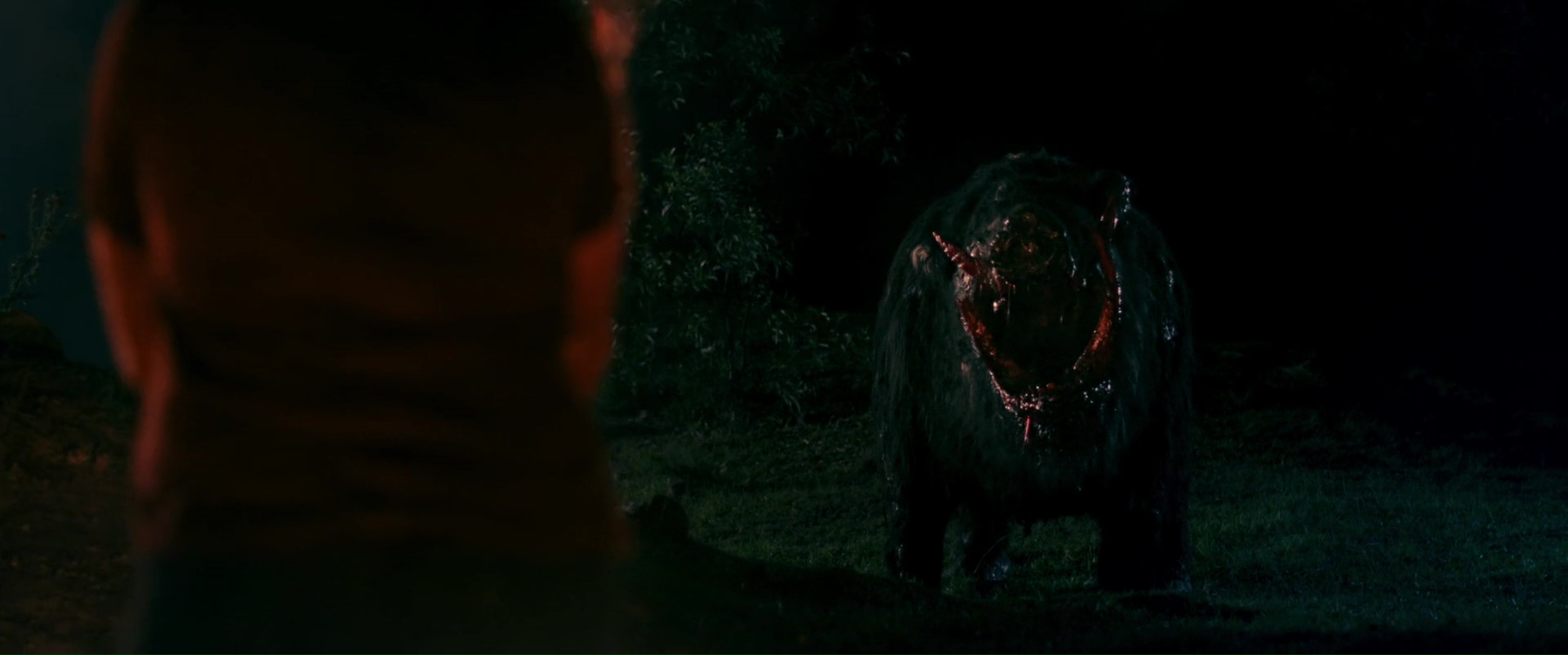 Et il a très faim, forcément, sinon, pas de film. Toutes les dix minutes, le voilà en train de s’en prendre à sa prochaine victime, les écrasant sous ses gigantesques pattes, les déchiquetant et mâchant dans ses mâchoires, les transperçant de part et d’autres avec ses cornes. C’est parfois ultra gore, et malgré un montage parfois maladroit, on parvient à comprendre toujours ce qu’il se passe à l’écran. Du coup, on passe son temps à attendre la prochaine attaque, où le réalisateur nous montre à chaque fois un peu plus son animal, jusqu’à le cadrer lors de la dernière demi-heure dans son intégralité. Ce qui permet de mieux apprécier la bête, faite sur le plateau (à l’exception d’un plan en CGI, bien dégueulasse d’ailleurs). Et c’est un peu paradoxal, puisque du coup, Boar, malgré ses très nombreux défauts, réussi quelque peu dans l’objectif premier du genre en question, à savoir les attaques animales. Mais il peine vraiment clairement à passionner entre deux attaques, de par ses personnages débiles, ses acteurs pas top, ses dialogues peu intéressants, sa mise en scène pas honteuse mais loin d’être aussi enjouée lors des passages calmes que lors des attaques. Un film d’attaque animale assez classique au final, dans la moyenne du genre. Mais loin derrière Razorback.