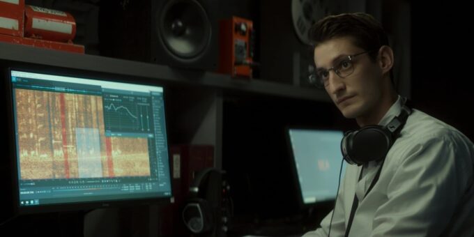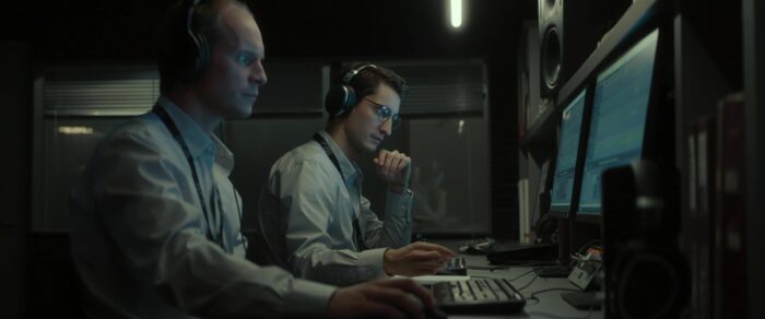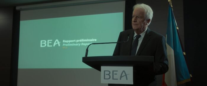 Blague à part, Boite Noire met donc en avant un personnage maniaque, travaillant sur le son, et devant analyser dans les moindres détails ce qui est récupérable des enregistrements de l’avion afin de comprendre ce qu’il s’est réellement passé. Accident technique ? Détournement ? Terrorisme ? Négligence ? Tout est possible, les enregistrements sont dans un état pitoyable, il va falloir tout analyser, tout nettoyer, comprendre, faire preuve de jugement, et surtout, ne pas interpréter ce que l’on entend, ou surtout, ce que l’on pense entendre, ou est persuadé d’entendre. Ce qui n’aurait pu être qu’un simple film de bureau avec des gens assis en train d’écouter des pistes audios prend rapidement des airs de thrillers manipulateurs, pour le plus grand plaisir des spectateurs, et surtout pour mon plus grand plaisir, tant Boite Noire accroche immédiatement le spectateur. Avec son scénario, malin, qui sait prendre son temps (et prouve que l’on n’a pas besoin de deux rebondissements à la minute pour s’intéresser à une histoire) et jouer sur les fausses pistes, avec sa mise en scène, calme et maitrisée (qui prouve que l’on n’a pas besoin de simuler du rythme avec un montage épileptique), avec ces acteurs confirmés tout en retenue, avec un design sonore ingénieux et même un savant mélange d’ambiance et de silence qui donne une lourdeur non pas au récit, mais à l’ambiance donc, et nous accroche. Comme dans tous les films du genre, les fausses pistes sont là, notre personnage principal ne veut pas lâcher prise tant qu’il n’aura pas découvert la vérité et en aura les preuves tangibles même lorsque tout le monde est contre lui, et le film nous fait douter, des événements, de ce qu’il nous montre, mais surtout de ce qu’il nous fait écouter, comme si le spectateur devenait le temps du film autant actif dans le déroulement et l’analyse sonore que le personnage.