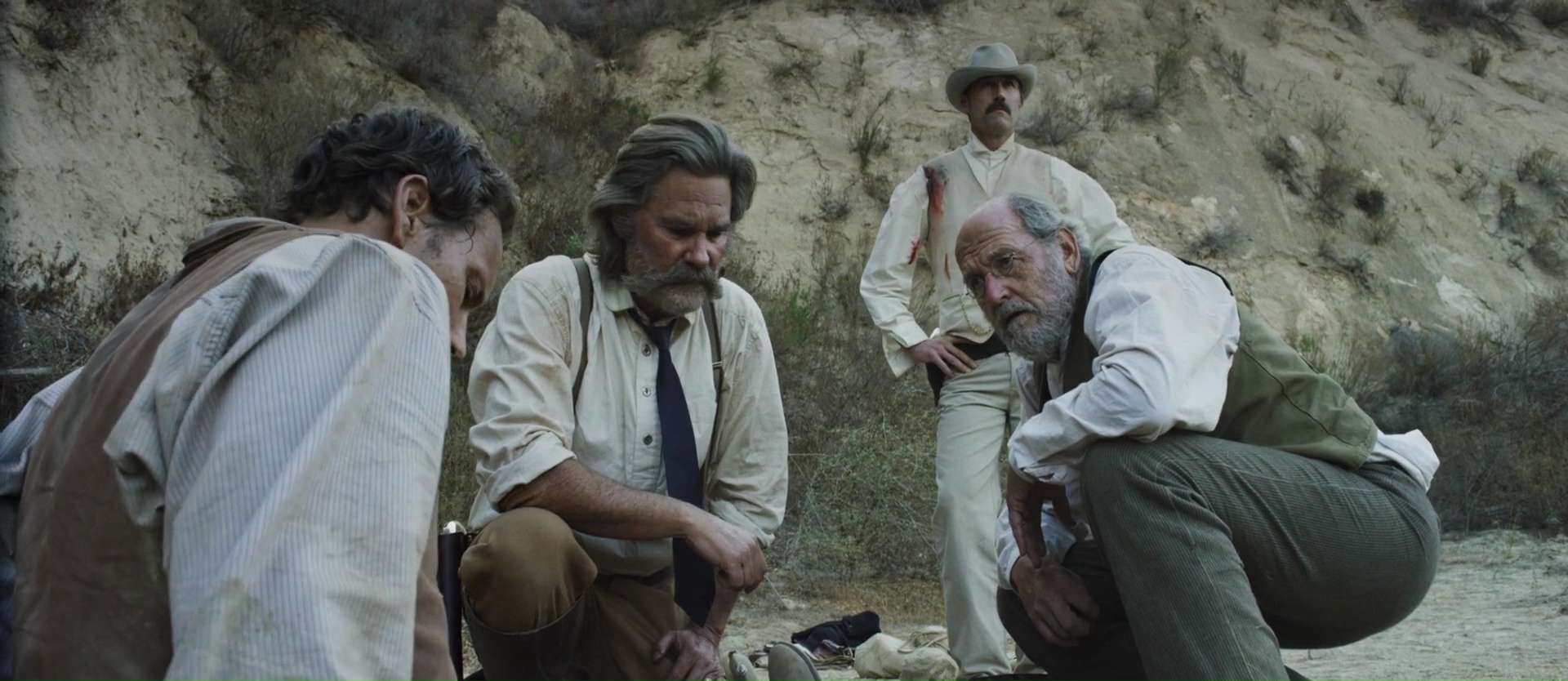 S. Craig Zahler a su s’entourer d’une très solide équipe, devant et derrière la caméra, pour donner de la crédibilité à l’univers dépeint, et là, réussite totale. La photographie de Benji Bahshi (qui collaborera de nouveau avec le réalisateur) est sublime, la musique signée par le réalisateur et son fidèle collaborateur Jeff Herriott discrète, le film préférant souvent jouer sur le silence écrasant et étouffant avec réussite encore une fois, et devant la caméra, les talents se bousculent. Kurt Russell n’a plus rien à prouver et joue le shérif âgé, Patrick Wilson (Conjuring, Insidious, Aquaman) campe un estropié convaincant, Matthew Fox (Lost) est un pistolero efficace et froid, Richard Jenkins (trop de films pour n’en citer que quelques uns) est énorme en second du shérif fatigué qui ne peut s’empêcher de parler pour camoufler ses craintes, et à tout cela s’ajoute quelques seconds rôles sympathiques, comme Lili Simmons en kidnappée par des cannibales et David Arquette qui décidément aime mourir et se faire manger. Cette joyeuse équipe, sur le papier certes un peu clichée mais finalement finement écrite, va devoir traverser l’Ouest pour trouver la planque d’une tribu cannibale vivant dans des grottes et qui a kidnappé la femme de notre pauvre estropié, en plus d’un des adjoints du shérif. Quelques chevaux, et c’est parti pour l’aventure comme on dit. De prime abord, Bone Tomahawk pourra en rebuter certains qui s’attendaient à un film plus rentre dedans, puisqu’en effet, le film prend son temps (mais sans ennuyer), prenant pendant environ 1h30 un aspect de western hautement réaliste. Réaliste car ultra violent. Le danger est partout, le monde est remplit de truands qui n’attendent qu’une chose, c’est que nous partions dormir à la belle étoile pour nous égorger dans notre sommeil et pouvoir nous voler nos affaires et nos chevaux. C’est sombre, violent, sans concessions, prenant et poignant. Le genre de film qui ne nous prend pas par la main, mais qui pourtant nous hypnotise dés que nos personnages partent à l’aventure après une petite demi-heure de présentation obligatoire.