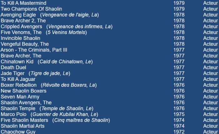 Originaire de Chine continentale en 1949, il déménage à Hong Kong avec sa famille alors qu’il est encore bébé pour fuir le régime de Mao. Mauvais élève à l’école (il se bat trop !), Johnny est même renvoyé de son établissement et se retrouve sans diplôme et sans travail. Pour survivre, il joue de la guitare dans des bars et autres clubs. Un jour, il voit dans le journal une annonce annonçant la recherche de nouveaux acteurs par Chang Cheh. Johnny tente sa chance et intègre immédiatement l’équipe régulière de l’ogre. Il fait ses débuts au cinéma dans Shaolin Martial Arts, tourné en 1974. Plus que son jeu d’acteur, franchement rigide, ce sont ses capacités physiques qui impressionnent. Il faut dire que Wang s’était mis aux arts martiaux alors qu’il n’était encore qu’adolescent. Etrangement, cet amour pour les arts de combats n’est pas né de la vision des films d’action de l’ex colonie britannique mais de la vision de films de James Bond ! Il apprendra d’abord le Hung Gar mais, ne trouvant pas ça assez efficace, il s’orientera vers le Karaté. Ses talents martiaux seront régulièrement mis à contribution pour les films de Chang, alors dans sa période Taiwanaise. Invariablement, Johnny y jouera le méchant de service : Marco Polo, Five Shaolin Masters… 3 ans après avoir été recruté par Cheh, Johnny se met sous contrat direct avec la Shaw Brothers. Une sage décision car il va devenir un des acteurs les plus demandés du studio, enchaînant parfois jusqu’à 10 films par ans. Il travaillera bien sur avec Chang Cheh, celui qui l’a découvert, comme sur Heaven And Hell Gate ou Two Champions Of Shaolin mais leur collaboration prendra fin après que Johnny ait rallié la Lau Team. Le réalisateur de Vengeance ! avait d’ailleurs déjà puni l’acteur pour avoir travaillé avec son ancien chorégraphe en lui faisant incarner le juge de The Five Venoms, un rôle important mais sans action. C’est certainement dans ses collaborations avec Lau Kar Leung que Johnny trouvera ses meilleurs rôles. Dans Dirty Ho, il interprète un dangereux assassin, expert en vin, qui donne du fil à retordre à Gordon Lau. The Eight Diagram Pole Fighter, Return To The 36th Chamber, My Young Auntie ou Lady Is The Boss le voient dans son rôle type : Celui du grand méchant final. Son duel face à Lau himself dans My Young Auntie est d’ailleurs un des plus beaux combats jamais filmés ! Mais son meilleur rôle, on le trouve certainement dans Martial Club. Ici, Johnny ne joue pas une de ces crapules dont on a l’habitude mais un maître du nord, respectueux des valeurs martiales mais manipulé. Excellent personnage, excellente prestation et superbe final font du film un must pour tous les fans du grand Wang Lung Wei. Il trouvera d’autres occasions de montrer son talent à la Shaw. Ainsi, dans Roar Of The Lion, il participe à un superbe combat contre Chin Yuet Sang et Sharon Yeung. De même, dans The Master, il combat Chen Kuan Tai et Yuen Tak avec panache. A croire que les prestations martiales ébouriffantes sont son quotidien… Malgré son emploi du temps bien rempli pour la Shaw, il trouvera aussi le temps de travailler pour quelques compagnies indépendantes. C’est ainsi qu’on le verra dans Two On The Road (face à Leung Kar Yan et Philip Ko) ou Two Toothless Tigers (où il est un véritable tueur, dans tous les sens du terme). Un des films les plus étonnants de cette période est, sans hésitation, Health Warning. Dans un rôle positif, Johnny casse du nazi et affronte même un boxer Thai huilé joué par Elvis Tsui. Surréaliste… Profitant du déclin de plus en plus marqué de la Shaw dans les années 80, Johnny parvient à obtenir le poste de réalisateur. Il signera ainsi This Man is Dangerous et Hong Kong Godfather, deux polars d’action ultra violents, le dernier préfigurant Police Story, qui obtiendront de raisonnables succès. La réalisation restera une activité secondaire dans sa carrière mais il continuera tout de même dans cette voie à l’occasion. Parmi ses plus grandes réussites, on peut citer l’excellent Girls With Guns Widow Warriors ou l’agressif Angry Ranger. Avec la fin de la Shaw, versant cinéma, en 1985, Johnny va obtenir des rôles moins intéressants. Il apparaîtra surtout pour des courts combats (Project A II ou The Seventh Curse). Frustrant quand on sait de quoi il est capable. Un de ses rares rôles d’importance se trouve dans The Twin Dragons où il affronte longuement Jackie Chan. Les années 90 voient Wang disparaître graduellement des grands écrans de Hong Kong, préférant se concentrer sur les petits où ses séries d’action sont encore populaires. Il aura ainsi l’occasion de se frotter à la nouvelle génération d’artistes martiaux comme Fan Siu Wong et retrouvera même d’anciennes légendes comme Gordon Lau. Nul doute qu’entre deux tournages, les deux hommes discutent de leur ancienne période de gloire, quand ils étaient des piliers de la Shaw Brothers ! Arnaud Lanuque (juillet 2004)