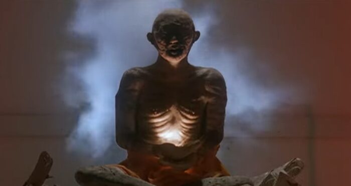 Cette référence Italienne n’est pas innocente car on peut légitimement penser que Kwei avait eu l’occasion de visionner quelques longs métrages d’exploitation en provenance de Rome tant cette surenchère mi-gores, mi répugnantes fait penser aux œuvres des petits maîtres du genre (Lucio Fulci et Ruggero Deoddato en tête). Cela ne veut pourtant pas dire que Boxer’s Omen n’est qu’une simple transposition de ce type de films dans un nouveau lieu. Car l’œuvre de Kwei fait preuve d’une sensibilité Asiatique unique qui achève de donner tout son sel à ce Boxer’s Omen. Ainsi, c’est dans une véritable plongée dans la mystique Bouddhique que l’on est transporté. Le metteur en scène s’est considérablement appliqué à donner forme à des notions théologiques telle que cette longue initiation de Philip Ko où les soutras récitées prennent forme dans son corps.