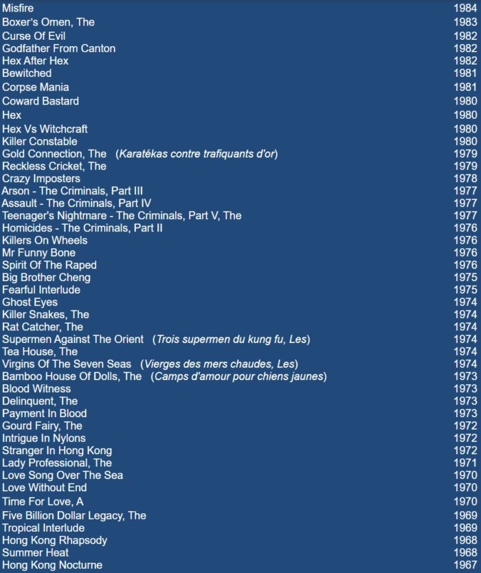 En 1967, il revient à Hong Kong et entre à la Shaw Brothers, il travaille en tant qu’assistant sur la comédie musicale Hong Kong Nocturne du japonais Inoue Umetsugu. En 1970, il réalise son premier film, une comédie musicale Love Song Over The Sea sur un scénario de lui-même. Puis viendront toute une série de comédies et de films d’action avec l’actrice Lily Ho. En 1972, il fait sa première incursion dans le film de sabres fantaisistes avec The Gourd Fairy. La même année il dirigera Jackie Chan dans un rôle secondaire, avec une comédie dramatique Stranger In Hong Kong. L’année suivante, il réalise son film le plus célèbre en Occident, The Bamboo House Of Dolls (Camps d’Amour pour Chiens Jaunes) , un des précurseurs de la « catégorie 3 » HK avec Lo Lieh en gardien de prison pour femmes. L’année suivante il signe The Killer Snakes, un film d’horreur sur un scénario de Ni Kuang, avec l’actrice Maggie Lee et l’excellent film de triades The Tea House avec Chen Kuan Tai en « parrain », un film qui au passage déclenchera les foudres de la censure et une grande polémique du fait de son approche réaliste et de la vision qu’il donne de la pègre… Ce réalisateur qui n’a pas les qualités formelles de réalisation d’un Chang Cheh, devient alors un yes-man au service de Run Run Shaw, ce qui ne l’empêche pas de signer quelques perles dans divers genres. En 1975, il réalise un nouveau polar sur fond de triades, il s’agit de Big Brother Cheng avec toujours Chen Kuan Tai et l’actrice Karen Yip. Il enchaînera ensuite sur une série de films dans ce genre. Cinq ans plus tard il réalise son chef d’œuvre, un wu xia pian très sombre et violent avec Chen Kuan Tai et Ku Feng, il s’agit de Killer Constable (dont l’édition par Celestial Pict. en dvd constitue l’une des plus grandes attentes), l’acteur Dick Wei y faisant d’ailleurs une apparition. Les derniers films de Gwai Chi Hung vont d’un étrange film d’horreur sur fond de boxe avec Philip Ko Fei et Bolo Yeung à un polar avec Alex Man. Il quitte Hong Kong au moment de la fermeture des studios de la Shaw Brothers et émigre aux Etats-Unis. Là, il travaille pour la télévision et décède le 1er octobre 1999. Philippe Quevillart (janvier 2003)