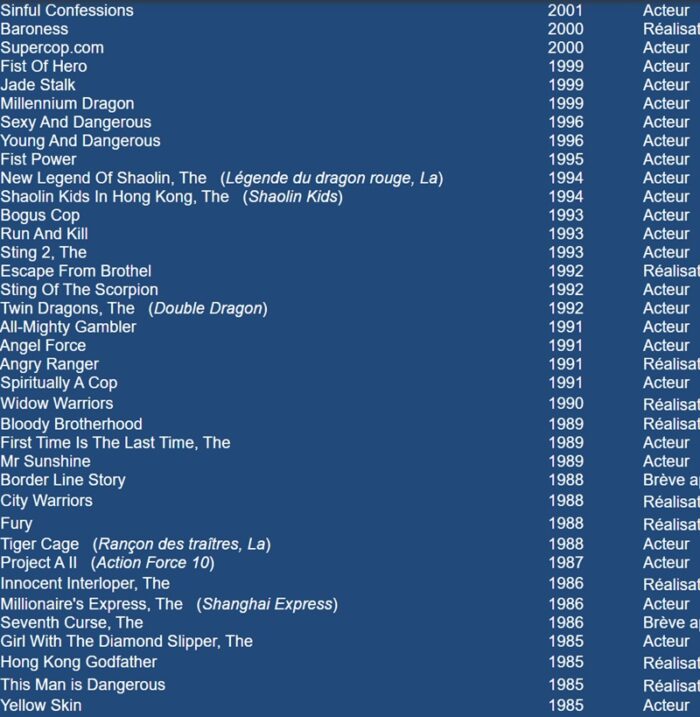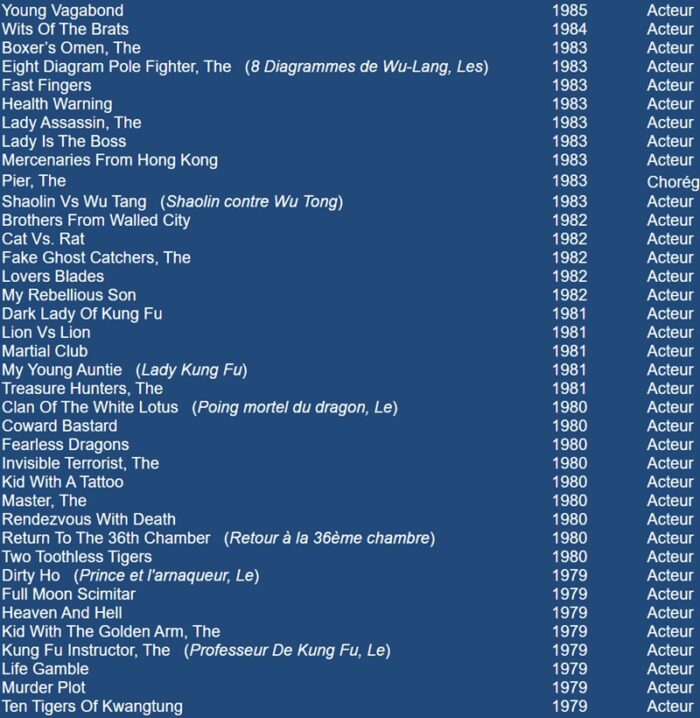 Originaire de Chine continentale en 1949, il déménage à Hong Kong avec sa famille alors qu’il est encore bébé pour fuir le régime de Mao. Mauvais élève à l’école (il se bat trop !), Johnny est même renvoyé de son établissement et se retrouve sans diplôme et sans travail. Pour survivre, il joue de la guitare dans des bars et autres clubs. Un jour, il voit dans le journal une annonce annonçant la recherche de nouveaux acteurs par Chang Cheh. Johnny tente sa chance et intègre immédiatement l’équipe régulière de l’ogre. Il fait ses débuts au cinéma dans Shaolin Martial Arts, tourné en 1974. Plus que son jeu d’acteur, franchement rigide, ce sont ses capacités physiques qui impressionnent. Il faut dire que Wang s’était mis aux arts martiaux alors qu’il n’était encore qu’adolescent. Etrangement, cet amour pour les arts de combats n’est pas né de la vision des films d’action de l’ex colonie britannique mais de la vision de films de James Bond ! Il apprendra d’abord le Hung Gar mais, ne trouvant pas ça assez efficace, il s’orientera vers le Karaté. Ses talents martiaux seront régulièrement mis à contribution pour les films de Chang, alors dans sa période Taiwanaise. Invariablement, Johnny y jouera le méchant de service : Marco Polo, Five Shaolin Masters… 3 ans après avoir été recruté par Cheh, Johnny se met sous contrat direct avec la Shaw Brothers. Une sage décision car il va devenir un des acteurs les plus demandés du studio, enchaînant parfois jusqu’à 10 films par ans. Il travaillera bien sur avec Chang Cheh, celui qui l’a découvert, comme sur Heaven And Hell Gate ou Two Champions Of Shaolin mais leur collaboration prendra fin après que Johnny ait rallié la Lau Team. Le réalisateur de Vengeance ! avait d’ailleurs déjà puni l’acteur pour avoir travaillé avec son ancien chorégraphe en lui faisant incarner le juge de The Five Venoms, un rôle important mais sans action. C’est certainement dans ses collaborations avec Lau Kar Leung que Johnny trouvera ses meilleurs rôles. Dans Dirty Ho, il interprète un dangereux assassin, expert en vin, qui donne du fil à retordre à Gordon Lau. The Eight Diagram Pole Fighter, Return To The 36th Chamber, My Young Auntie ou Lady Is The Boss le voient dans son rôle type : Celui du grand méchant final. Son duel face à Lau himself dans My Young Auntie est d’ailleurs un des plus beaux combats jamais filmés ! Mais son meilleur rôle, on le trouve certainement dans Martial Club. Ici, Johnny ne joue pas une de ces crapules dont on a l’habitude mais un maître du nord, respectueux des valeurs martiales mais manipulé. Excellent personnage, excellente prestation et superbe final font du film un must pour tous les fans du grand Wang Lung Wei. Il trouvera d’autres occasions de montrer son talent à la Shaw. Ainsi, dans Roar Of The Lion, il participe à un superbe combat contre Chin Yuet Sang et Sharon Yeung. De même, dans The Master, il combat Chen Kuan Tai et Yuen Tak avec panache. A croire que les prestations martiales ébouriffantes sont son quotidien… Malgré son emploi du temps bien rempli pour la Shaw, il trouvera aussi le temps de travailler pour quelques compagnies indépendantes. C’est ainsi qu’on le verra dans Two On The Road (face à Leung Kar Yan et Philip Ko) ou Two Toothless Tigers (où il est un véritable tueur, dans tous les sens du terme). Un des films les plus étonnants de cette période est, sans hésitation, Health Warning. Dans un rôle positif, Johnny casse du nazi et affronte même un boxer Thai huilé joué par Elvis Tsui. Surréaliste… Profitant du déclin de plus en plus marqué de la Shaw dans les années 80, Johnny parvient à obtenir le poste de réalisateur. Il signera ainsi This Man is Dangerous et Hong Kong Godfather, deux polars d’action ultra violents, le dernier préfigurant Police Story, qui obtiendront de raisonnables succès. La réalisation restera une activité secondaire dans sa carrière mais il continuera tout de même dans cette voie à l’occasion. Parmi ses plus grandes réussites, on peut citer l’excellent Girls With Guns Widow Warriors ou l’agressif Angry Ranger. Avec la fin de la Shaw, versant cinéma, en 1985, Johnny va obtenir des rôles moins intéressants. Il apparaîtra surtout pour des courts combats (Project A II ou The Seventh Curse). Frustrant quand on sait de quoi il est capable. Un de ses rares rôles d’importance se trouve dans The Twin Dragons où il affronte longuement Jackie Chan. Les années 90 voient Wang disparaître graduellement des grands écrans de Hong Kong, préférant se concentrer sur les petits où ses séries d’action sont encore populaires. Il aura ainsi l’occasion de se frotter à la nouvelle génération d’artistes martiaux comme Fan Siu Wong et retrouvera même d’anciennes légendes comme Gordon Lau. Nul doute qu’entre deux tournages, les deux hommes discutent de leur ancienne période de gloire, quand ils étaient des piliers de la Shaw Brothers ! Arnaud Lanuque (juillet 2004)
