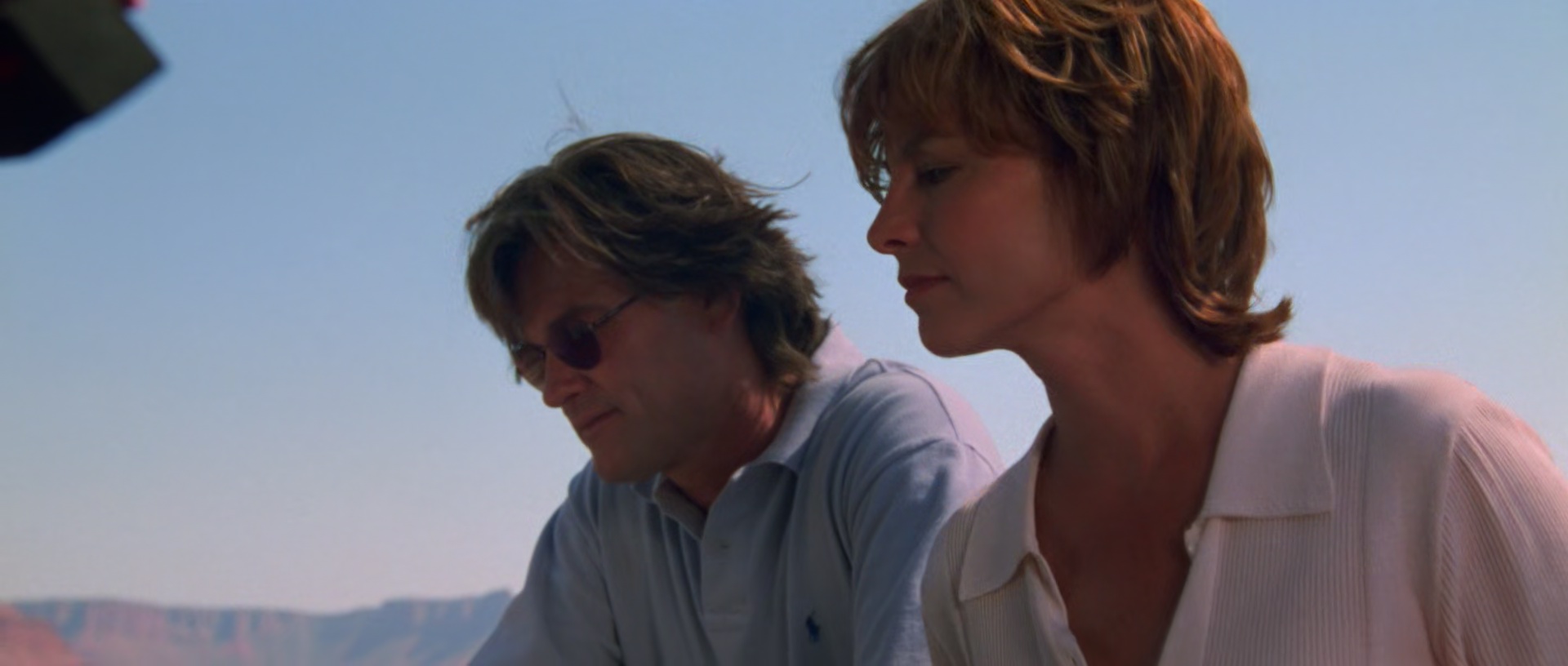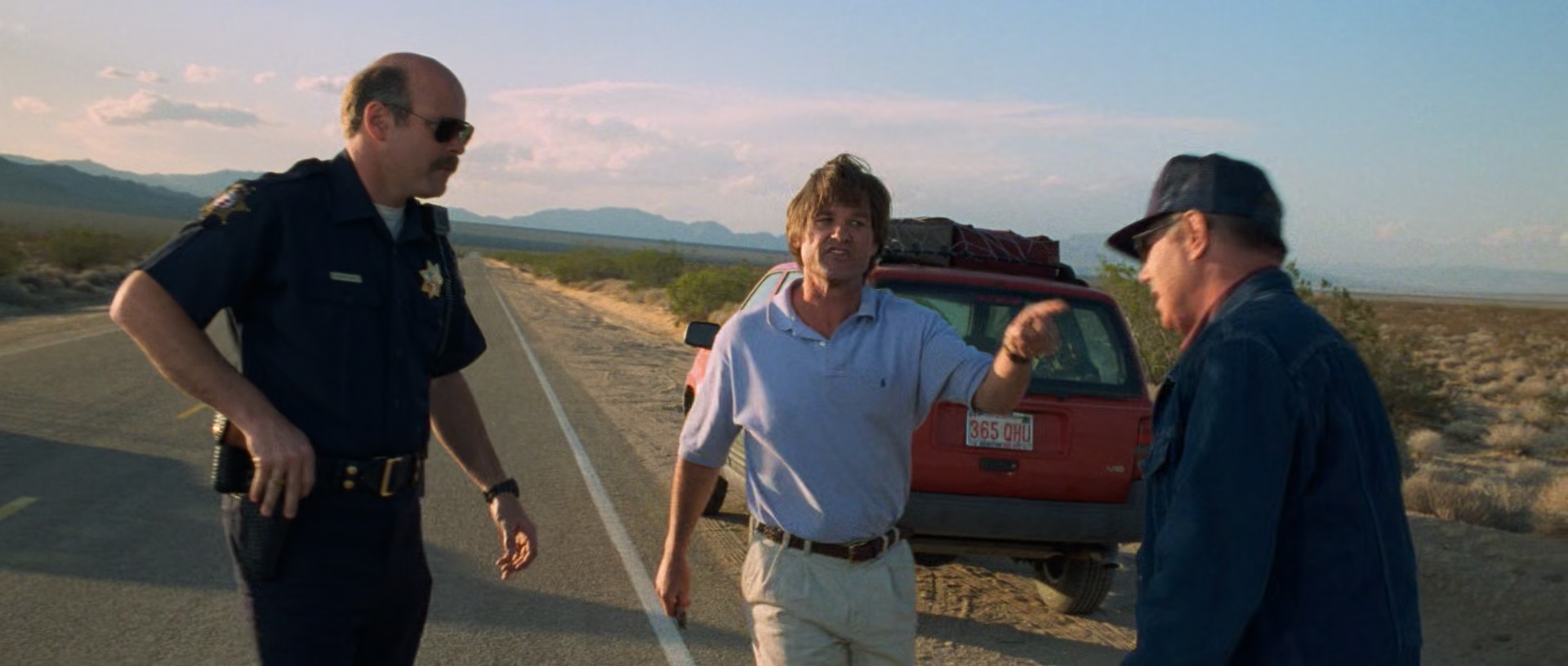 Pas grave, Jeff, confus, reprend la route, et tombera sur Red, qu’il arrête. Un flic passe par là, tout peut alors s’arranger. Seulement Red nie avoir déjà vu Jeff ou même sa femme, son camion est fouillé et vide. Jeff se retrouve seul, personne ne le croit, la police ne bouge pas, et il se rend compte que les disparitions (ou fuites) sont courantes dans le coin. Oui, en soit, l’intrigue de Breakdown n’est pas nouvelle. Ce n’est de toute façon pas ça qui fait sa force. Breakdown, qui a été filmé chronologiquement pour plus de réaliste de la part des acteurs, est un thriller, ou plutôt un film à suspense admirable dans ce qu’il entreprend. La mise en scène de Jonathan Mostow (qui fut repéré par ce film, et réalisera par la suite le sympathique et inutile Terminator 3) est tendue, proche des personnages, et n’en fait jamais trop, le scénario est simple mais n’a aucune longueur, les acteurs sont investis, Kurt Russell y est d’ailleurs magistral, tellement que l’on pourrait presque sentir sa peur et son stress à travers l’écran. Même le score musical de Basil Poledouris est aussi simple qu’efficace. La force de Breakdown, c’est d’aller vite où il doit aller, de nous faire rentrer dans son ambiance et ce malgré quelques facilités scénaristiques. Oui, on est censé être au milieu de nul part, avec des routes de plusieurs dizaines de kilomètres sans la moindre civilisation, et pourtant le hasard fait très souvent les choses, les flics étant souvent là où il faut au bon moment, décidant de faire leur tournée par là. Tout s’enchaine bien, voir trop bien, sans pour autant que cela soit gênant, et ça c’est déjà un tour de force en soit. Pour autant, et ce malgré les facilités, Breakdown reste tendu et réaliste. Pas d’héroïsme, de scènes over the top (bon, à part peut-être un moment bien tardif), de poursuites de 20 minutes en voitures dans le désert, ni même de personnage principal invincible qui se relève toujours. Jeff est un humain, comme vous et moi, qui a souvent peur pour sa vie, échappe parfois à la mort de justesse, et qui se retrouve acculé, avec sa femme kidnappée, avec des demandes folles qu’il ne peut absolument pas remplir, qui devient paranoïaque de tout et de tout le monde.