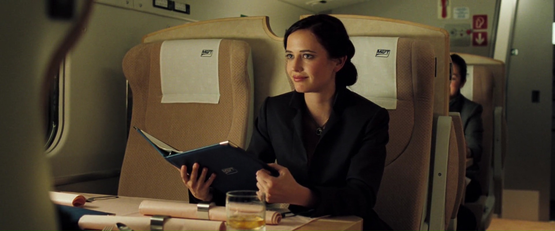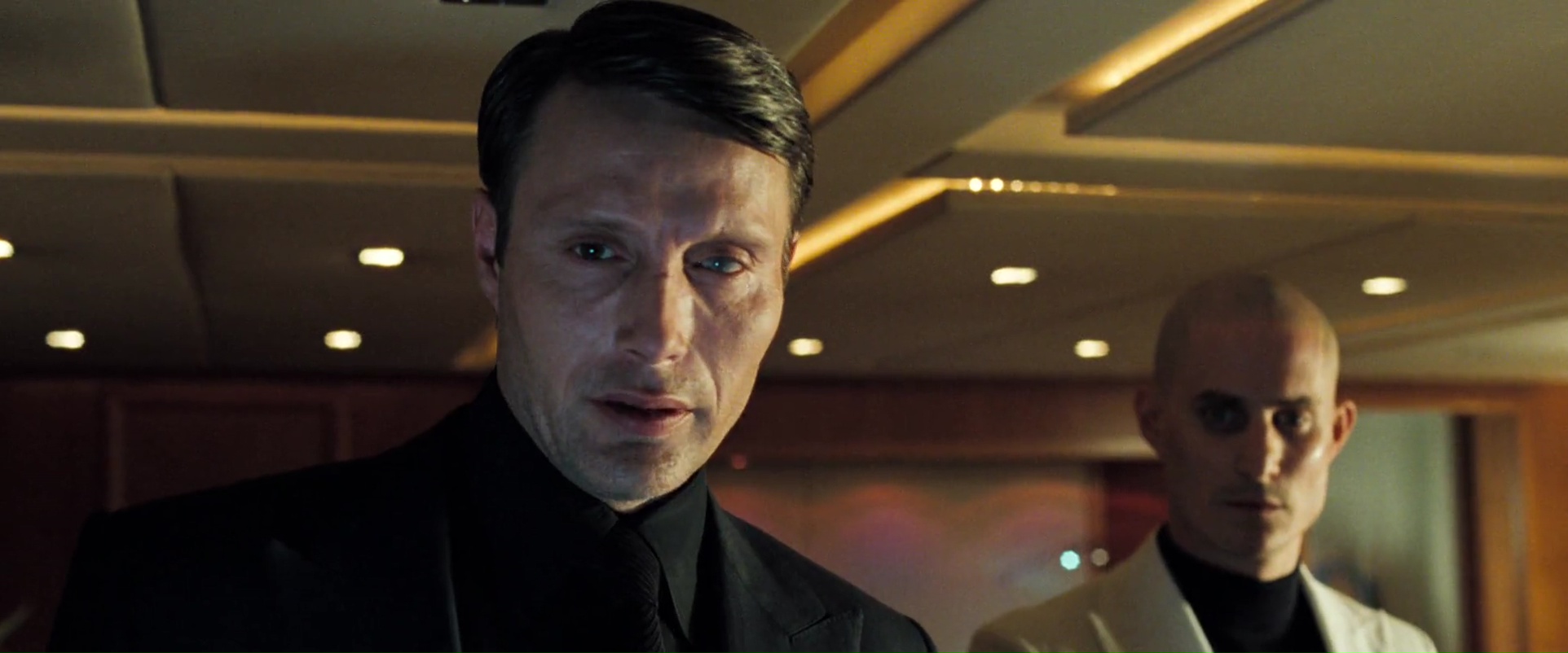 En fait, un peu à la manière de Goldeneye, ou des opus de Dalton avant lui, Casino Royale fait de bons choix. En premier lieu, celui de trouver un parfait équilibre entre exposition, développement et action. L’action est présente, impressionne même de nouveau maintenant qu’il ne s’agît plus de CGI et de débilités à base de surf sur des tsunamis et d’autres palais de glace, et est présente pour récompenser le spectateur plutôt que pour faire avancer l’intrigue. De ce fait, l’action est plus froide, plus violente, plus basée sur le physique que de la destruction pyrotechnique, mais également au final plus rare. Finit les scènes d’action qui débarquent toutes les 10 minutes comme dans les films précédents, Casino Royale ne nous offre véritablement que 4 scènes d’action, sur 2h24, soit l’opus le plus long de la saga lors de sa sortie. Et ces scènes valent le détour, avec notamment la poursuite du début, ou encore la longue poursuite de l’aéroport ou le combat dans les escaliers. Daniel Craig campe un James Bond fort convaincant, beaucoup plus proche apparemment du personnage littéraire, et du coup, plus proche également de la prestation de Dalton. Bond est un humain après tout, il devra faire face à des dilemmes, il peut souffrir, saigner, douter. Ça fait du bien de retrouver un personnage comme ça, surtout quand le scénario suit derrière, et que la mise en scène sait rythmer le tout. Car 4 scènes d’action pour 2h24, il faut forcément soigner le fond sinon le spectateur va s’ennuyer. Et ça marche, déjà grâce aux personnages secondaires extrêmement bien écrits, que ce soit Le Chiffre (Mads Mikkelsen) ou Vesper (Eva Green), jusqu’à des personnages secondaires moins présents, peu importe qu’ils soient nouveaux dans l’univers (Matthis, joué par Giancarlo Giannini) ou déjà connus via les anciens épisodes (Felix, à présent joué par Jeffrey Wright).
