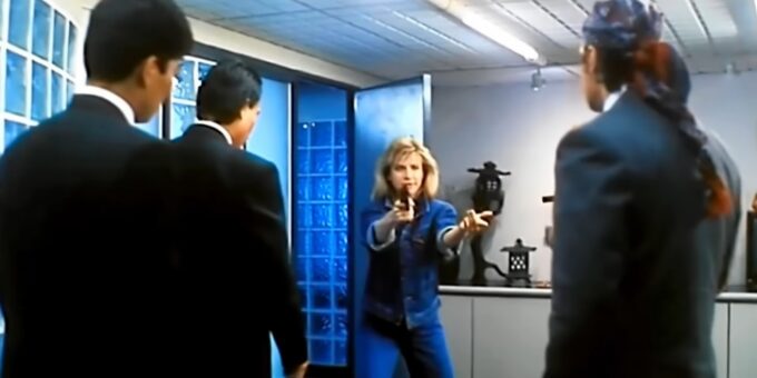 Heureusement, Rothrock est employée de bien meilleure façon dans les scènes de combat. Le premier survient 5 min dans le film et consiste surtout en une série de fusillades. Se déroulant dans un immeuble délabré plongé dans noir, la séquence bénéficie d’une atmosphère visuelle ténébreuse au vif éclat rouge et vert.