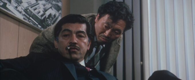Tout semble trop facile, trop précipité. Et pourtant, passé cet écueil initial, City of Beasts s’avère être un petit polar comme il en pleuvait dans les années 70, direct, hyper efficace, qui ne perds pas une seconde et après tout il ne dure même pas 1h30, et qui sait, quand il le faut, se faire bien violent. Fukuda Jun est donc dans un contexte à l’opposé de ces commandes pour le roi des monstres chez la Toho. Il y a même un côté ultra nihiliste dans le métrage, dans le fond lui aussi plutôt récurent à l’époque, mais qui fait néanmoins toujours plaisir à voir. Arima donc, va devenir ami avec Ishihama, devenir son chauffeur, et au fur et à mesure, s’impliquer dans les différentes magouilles, allant bien entendu jusqu’au meurtre. Il faut dire qu’une fois qu’on lui a offert un colt, Arima se prend un peu comme l’inspecteur Harry, dégainant plus vite que son ombre et refroidissant ceux qui se trouvent devant lui sans le moindre remord. Scénaristiquement, le métrage n’innove pas vraiment, et dans le fond, ne surprend guère. Un chef d’entreprise qui a atteint le sommet durant les miracles économiques de l’après-guerre, on se doute que tout n’est pas légal derrière tout ça. Arima qui se fait embaucher comme chauffeur alors qu’il ne l’a jamais vu conduire, et qu’il a juste été témoin de son talent avec les armes à feu, ça laisse également très peu de doute sur comment tout cela va se terminer. Chantage, bidouilles en bourse, incendies criminels, exécutions froides et expéditives, City of Beats ne fait pas dans l’originalité, mais il le fait avec un certain savoir-faire et une générosité qui font plaisir. Fukuda soigne véritablement sa mise en scène pour le coup, et ça fait plaisir de le voir prendre tout ça au sérieux.