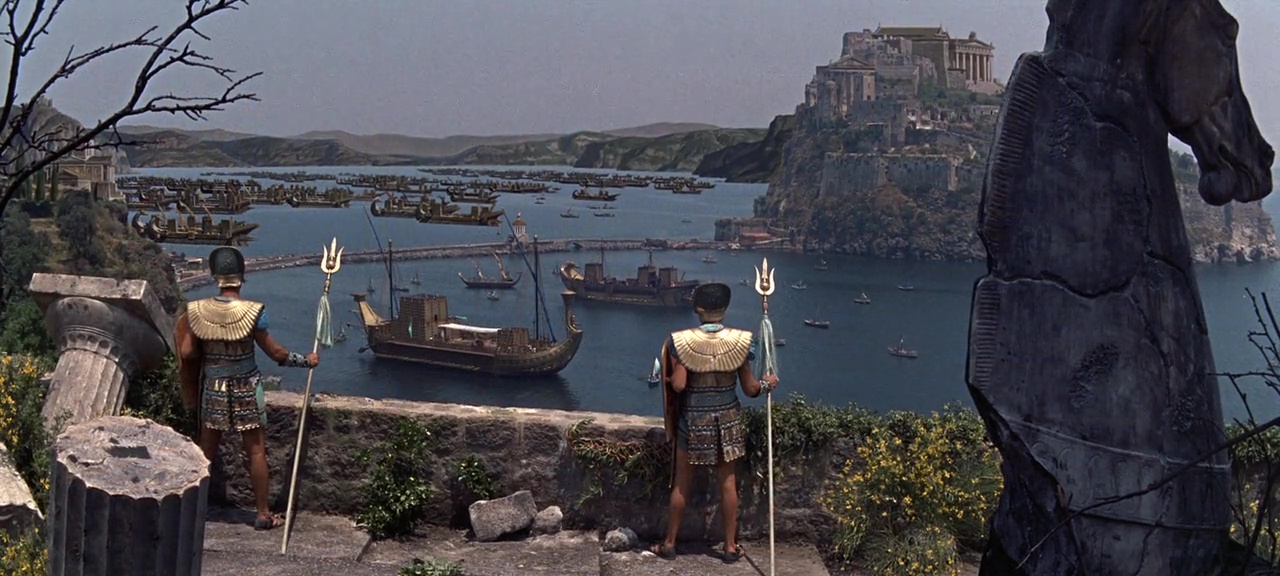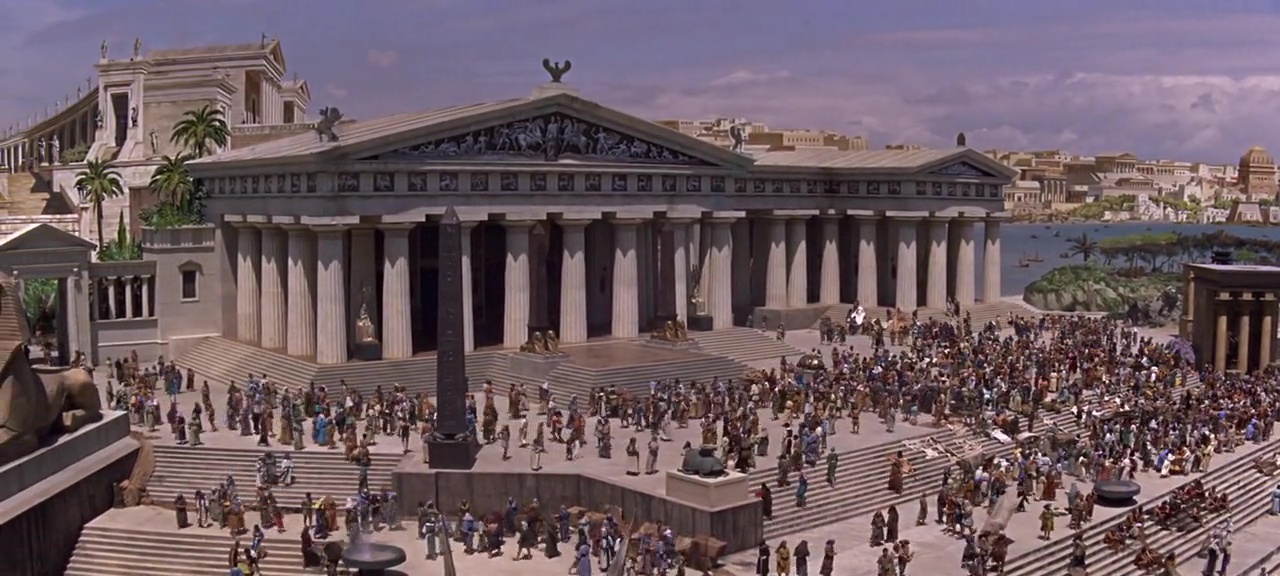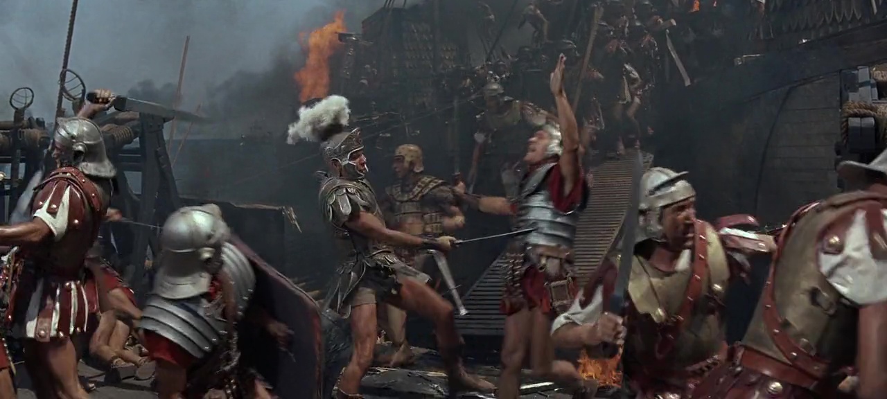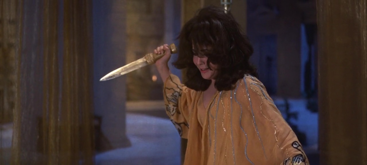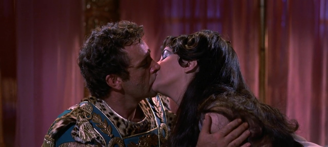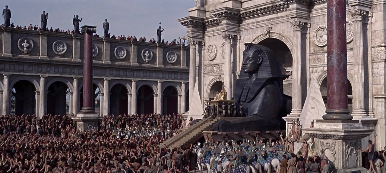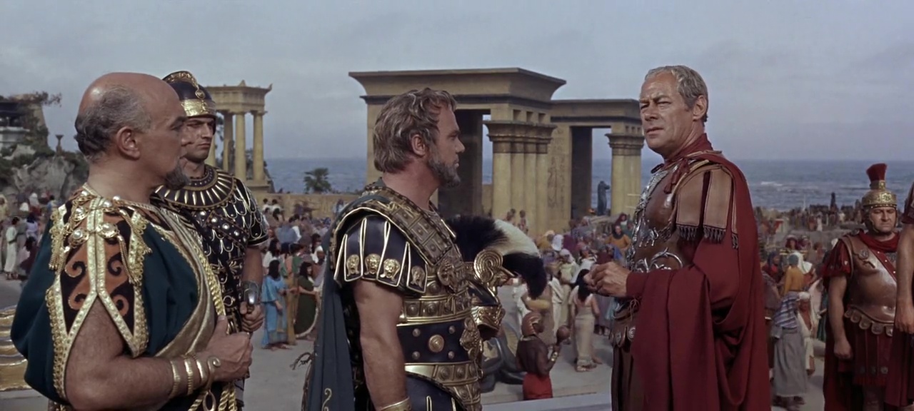 Rex Harrison est tout simplement exceptionnel dans le rôle de César, en cet homme en quête de plus de pouvoirs, ce qui le mènera à sa perte. Sa relation avec Cléopâtre est dés le départ une relation pleine de sous entendus. Attiré par la beauté de la jeune femme (entre nous, qui ne le serait pas ?), il deviendra son amant, allant jusqu’à lui faire un enfant, mais également lui laisser prendre des décisions politiques importantes, tentant de rapprocher l’Égypte de Rome. Si les sentiments de Cléopâtre pour César sont clairs et bien visibles, on ne peut pourtant s’empêcher d’y voir également un brin de manipulation afin que les décisions aillent dans le sens qui arrangent la dame. Romance, intrigues politiques, complots, la première partie de Cléopâtre nous montre une femme ambitieuse, sûre d’elle, sachant se mettre en avant même lorsqu’elle sort d’un vulgaire tapis. Aucun doute, le budget est présent, les figurants sont parfois des milliers à l’écran, les costumes (65 costumes rien que pour Cléopâtre) sont resplendissants, les décors somptueux. Comment ne pas parler d’ailleurs de l’arrivée majestueuse de Cléopâtre à Rome ? Une des scènes les plus sublimes de la première partie, témoignant à la fois de la grandeur d’une époque et de la grandeur du tournage qui semblait sans limites pour assouvir la vision du réalisateur. Revoir cela aujourd’hui fait de plus un bien fou, à l’heure où une telle production aurait eu recours au numérique pour finaliser les décors, mais également pour augmenter le nombre de figurants.