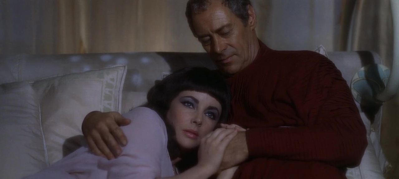 Mais une partie des décors est détruite, et le tournage délocalise alors près de Rome, où le temps est plus clément et où la production peut construire des décors gigantesques et majestueux. Peter Finch est remplacé alors par Rex Harrison et Stephen Boyd par Richard Burton. Elizabeth Taylor est soignée et frise la mort (des journalistes américains auront même annoncés son décès dans des journaux, faisant ainsi une grande frayeur au studio), et le tournage reprend. Un tournage qui va continuer de s’éterniser puisque Richard Burton et Elizabeth Taylor sont la cible des journalistes, commençant une liaison sur le tournage. Le budget lui continue d’augmenter dangereusement, et Joseph L. Mankiewicz est suivit médicalement pour mener le tournage à bout, commençant ses journées à 6h, et les finissant à 2h du matin, tournant le jour et écrivant les scènes du lendemain la nuit. Le tournage prend finalement fin, et le réalisateur vise alors deux métrages de trois heures. La première partie sur Cléopâtre et César, la seconde sur Cléopâtre et Marc Antoine. Malheureusement, le studio, avec un budget avoisinant maintenant les 44 millions (soit avec l’inflation, environ 300 millions aujourd’hui), au bord de la faillite, décide de jouer sur l’actualité : la relation entre les deux acteurs. Pas besoin de prendre le risque de sortir le film en deux parties, surtout si la relation entre les acteurs prend fin avant la sortie de la seconde. Le métrage fera donc 4 heures !