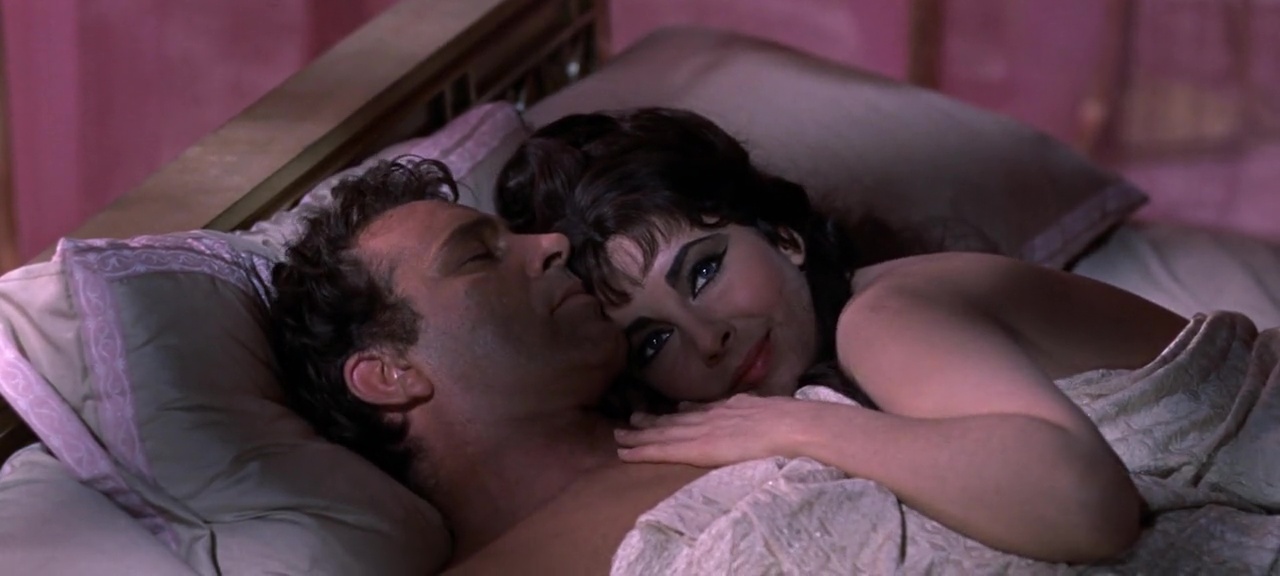Passé le final inévitable de cette première partie, l’entracte prend fin et Cléopâtre reprend trois années plus tard, pour se focaliser sur la relation entre Cléopâtre et Marc Antoine (Richard Burton donc). Une relation bien différente, car si la lutte de pouvoir à Rome est toujours présente, la relation se fait plus mélancolique, plus à fleur de peau. Elizabeth Taylor devient une reine plus fragile, se laissant parfois aller à ses sentiments en oubliant à quelques occasions le reste, même si au départ elle en fait voir de toutes les couleurs à Marc Antoine. Une seconde partie beaucoup plus triste également, notamment son magnifique final, mais qui m’aura demandé un minimum de temps d’adaptation, le personnage de Marc Antoine m’ayant au départ moins interpelé que celui de Jules César. Mais une fois la machine en marche, le métrage retrouve sa magie. On pourra toujours chipoter sur les quelques scènes de batailles, qui maintenant ne sont plus vraiment impressionnantes (les coups d’épées sont un peu mous), mais elles sont peu nombreuses et là n’est clairement pas l’intérêt de Cléopâtre le film. C’est toujours lorsque le réalisateur colle au plus près de ses personnages que cette seconde partie touche la grâce, notamment lorsque Marc Antoine, dévasté, ouvre son âme et son ressenti à Cléopâtre, toute aussi fragile que lui. Oui, Cléopâtre, c’est un grand moment de cinéma, une fresque épique autant à l’écran que dans sa production !