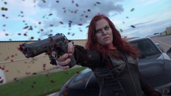 En attendant revenons à cette introduction où le mari, clown propriétaire d’un cirque chelou, était au courant du pot aux roses et assassine l’amant. Sa femme elle, qui serait facilement accusée du meurtre, est forcée à participer aux spectacles qui tiennent plus de la torture que du show habituel que l’on peut voir dans un cirque. Condamnée, tout comme le spectateur a subir ce premier quart d’heure trop long pour être vrai, Savanna, de son prénom, fait appel à la diseuse de bonne aventure de la troupe pour se débarrasser de son mari, Big Ronnie le clown de son nom de scène. Cette dernière fait appel aux forces obscures et déchaîne les enfers sous la forme d’une tornade qui va aspirer Big Ronnie et ses clowns de collègues. Le hic, c’est que les forces du mal digèrent mal cette troupe de clowns tellement maléfiques que même le prince des ténèbres n’en veut pas. Ils reviennent donc foutre le bordel en ville avec comme moyen de locomotion la tornade qui était censée mettre fin à leurs jours. Savanna va se faire très vite étriper, mais ressuscite pour une raison que j’ignore (rassurez-vous, le réalisateur également) et c’est à un redneck au grand cœur, une strip-teaseuse bad ass, un Elvis black, une ado en fugue qui se fait stalker par un supposé prédateur sexuel, et à un couple de chasseurs de tornades de stopper le massacre. Des personnages qui parviennent à devenir attachants, car il y a un véritable effort fait dans l’écriture. Chacun à sa petite personnalité et sa petite histoire, et bien que certaines scènes soient trop longues, notamment l’introduction en mode film noir que Sheets affectionne tant au point d’étirer ce qui aurait pu être raconté en cinq minutes alors que ça en prend le triple, et que les acteurs soient des amateurs complets mais plein de bonne volonté (le générique de fin en témoigne), Clownado évite un piège dans lequel beaucoup de métrages de ce calibre tombent : l’ennui entre deux scènes horrifiques. On notera tout de même au casting la présence de Eileen Dietz (les apparitions de Pazuzu dans l’Exorciste, c’était elle) et de Linnea Quigley dans une courte apparition qui va direct mettre un terme aux fantasmes que vous auriez pu avoir dans les années 80, n’est pas Barbara Crampton qui veut.