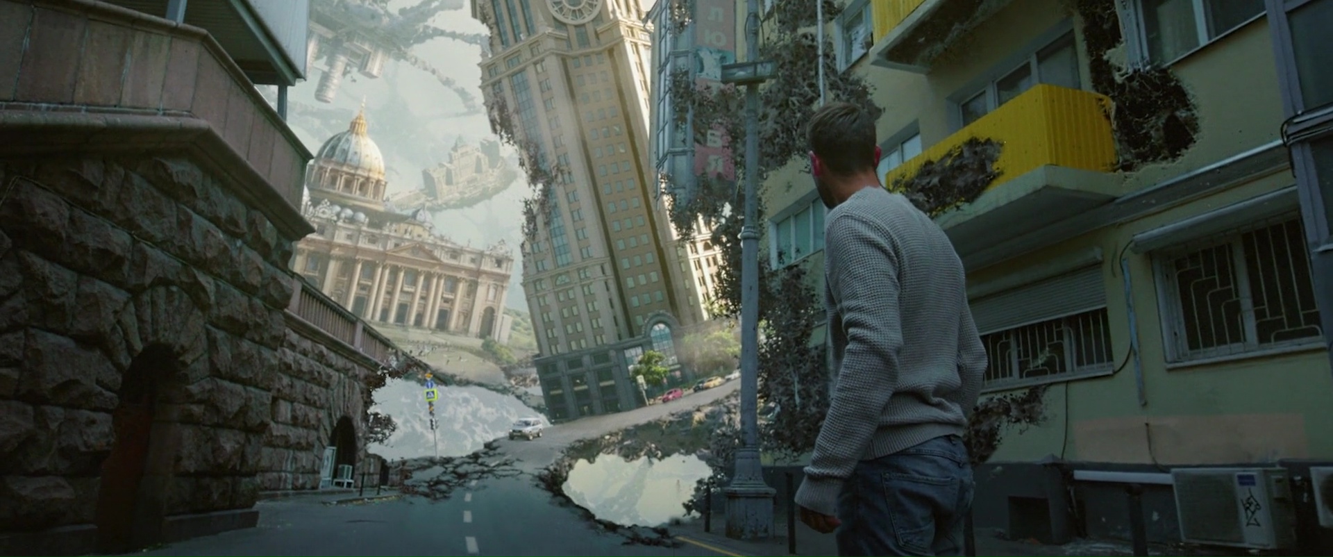 Continuons d’explorer le cinéma de genre Russe actuel voulez-vous bien ? Après le succès que fut Attraction en 2017, menant à une suite en 2020, et avant le succès énorme en VOD de Sputnik, voilà que débarquait Koma, ou Coma tel qu’il est renommé en France, sorti en Janvier 2020 en Russie. Un film mélangeant basiquement Inception pour son visuel et le jeu The Evil Within pour son concept. Alléchant n’est-ce pas ? Le tout en mode film à grand spectacle au budget énorme d’environ… 4 millions de dollars. Ah oui, je l’avais déjà dit, mais faire un film à effets spéciaux en Russie, ça n’a pas le même coût qu’ailleurs. À croire que les techniciens et autres responsables des effets spéciaux ne sont pas payés là-bas, ou acceptent juste un SMIC tant pour un film comme Coma, tout passe par le visuel, et que chaque plan semble contenir son lot d’effets digitaux et de fonds verts, sans pour autant que cela fasse tâche. Certes, ils ne sont pas tous parfaits, mais certains parviennent à impressionner, certains designs sont bien trouvés, et malgré tout, même pour ceux moins convaincants, on peut toujours les excuser, puisque comme son nom l’indique, Coma se déroule dans un monde imaginaire. Le pitch est simple, Viktor est un architecte et après un accident de voiture, le voilà dans le coma, dans un lit d’hôpital. Sauf qu’ici, le coma, c’est un peu plus excitant que dans notre monde à nous. Inconsciemment, le personnage se retrouve plongé dans un monde où la conscience de tous ceux dans le coma se mélange, où rêves et souvenirs s’entremêlent pour donner vie à un monde qui à première vue, n’a ni queue ni tête, où les routes sont de travers, la gravité change parfois brutalement, une forêt peut mener à un appartement avant de voir par la fenêtre une cascade, puis un monument connu normalement situé à l’autre bout du monde.