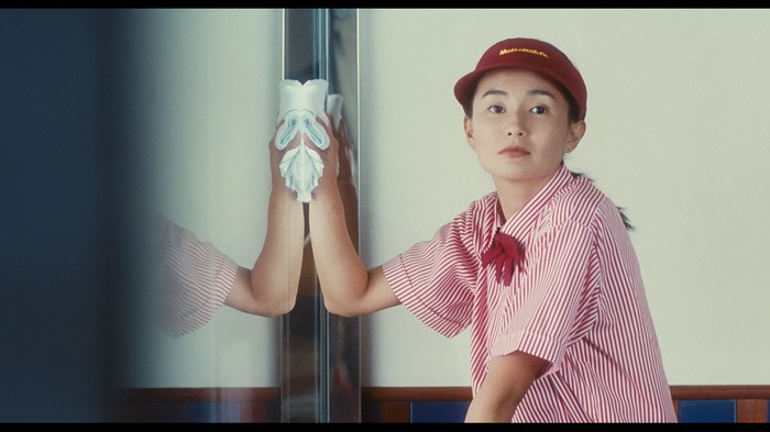 Durant son aventure hongkongaise, Xiao-jun croisera la route de la belle Li Chiao (Maggie Cheung), qui va l’aider dans son intégration. Chiao va faire office de mentor, va l’inviter dans des cours d’anglais, va lui trouver du travail, l’éduquer sur ce bon vieux capitalisme etc etc… Elle représente une autre facette de l’immigration, en quelque sorte opposée à Xiao-jun. Celui-ci est naïf, observateur émerveillé un brin passif. En léger décalage mais avec le sourire aux lèvres. Li Chiao est parfaitement intégrée, investie dans un système qu’elle comprend parfaitement. Sa place est déjà faite, son chemin déjà tracé. Elle représente l’immigré ayant transmuté en parfait produit de sa ville d’accueil, se qualifiant elle-même de pure hongkongaise. Dans le film, il est souligné tout de même qu’elle vient du Guangdong, donc elle se vante d’être plus proche de Hong Kong que les autres continentaux, le partage de la langue cantonaise servant d’argument. Ces deux univers relativement opposés (mais pas incompatibles) vont se rejoindre et former le cœur central du film. Développant une amitié grandissante, qui aboutira comme le titre ne nous l’indiquait pas, sur une histoire d’amour. Une amitié, donc, pour commencer. Amitié qui naît par hasard et qui se développe naturellement. Les personnages sont un soutien l’un pour l’autre. Ils s’accompagnent, se soutiennent, se protègent. Li Chiao reste cette figure rigoureuse et consciencieuse, responsable d’elle comme de Xiao-jun. Alors que celui-ci conservera son rôle de naïf optimiste et doucement empoté. Il réussira néanmoins à apporter un peu de douceur dans la vie de son amie. Et de son côté elle lui apportera une forme d’ancrage dans ce monde moderne. D’autant qu’ils s’avouent bien vite l’un à l’autre ne pas avoir d’autres amis (ce qui est un peu faux, mais soyons romantiques, laissons dire).