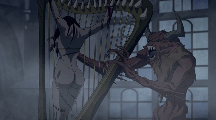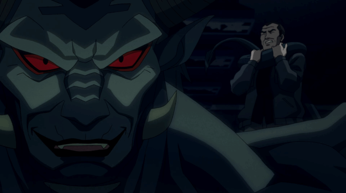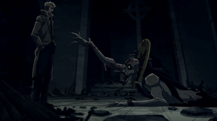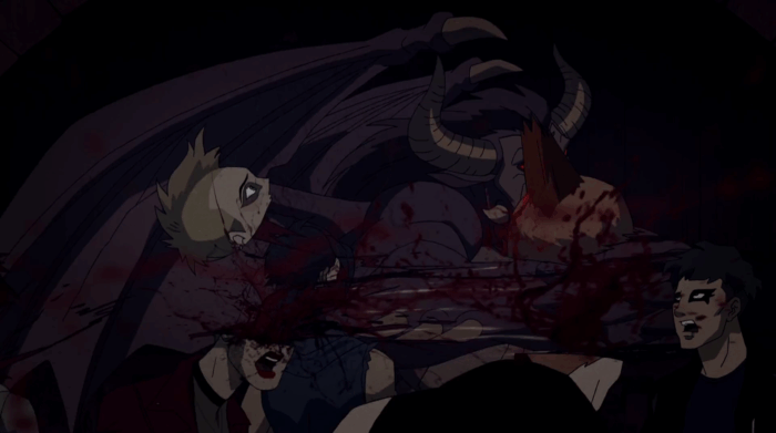 Mais là où Constantine: City of Demons constitue une prise de risque, plus que de présenter un anti-héros dans le fond assez détestable, c’est dans la représentation de la violence dans l’univers animé DC. Suicide Squad: Le Prix De L’ Enfer avait entrouvert une porte, City Of Demons l’enfonce. Entre une gamine trainée en enfer et une fête infernale pleine de damnés qui se font torturer, les auteurs se lâchent et ne font preuve d’aucune retenue lorsqu’il s’agit de montrer des décapitations, éviscérations, corps démembrés ou arrachés dans du gore qui parfois tache bien, ou même des chauves-souris qui sortent d’un cul. Constantine: City of Demons est un métrage animé sombre, gore destiné à un publique adulte, même la musique ne part jamais dans une quelconque envolée lyrique super héroïque mais participe au contraire à l’ambiance horrifique qui plane sur l’entièreté d’un film animé qui cherche avant tout à transposer l’univers du comic book plutôt qu’à l’aseptiser pour plaire au plus grand nombre.