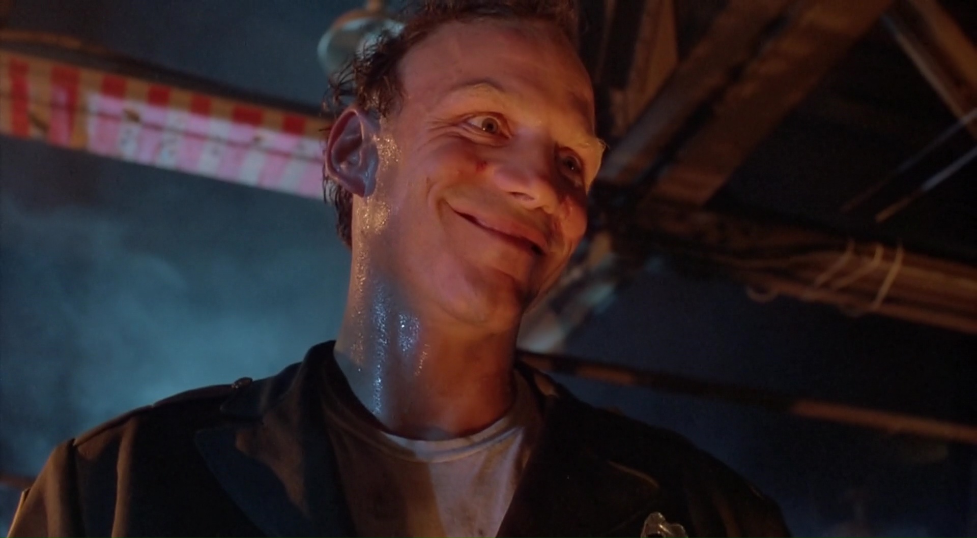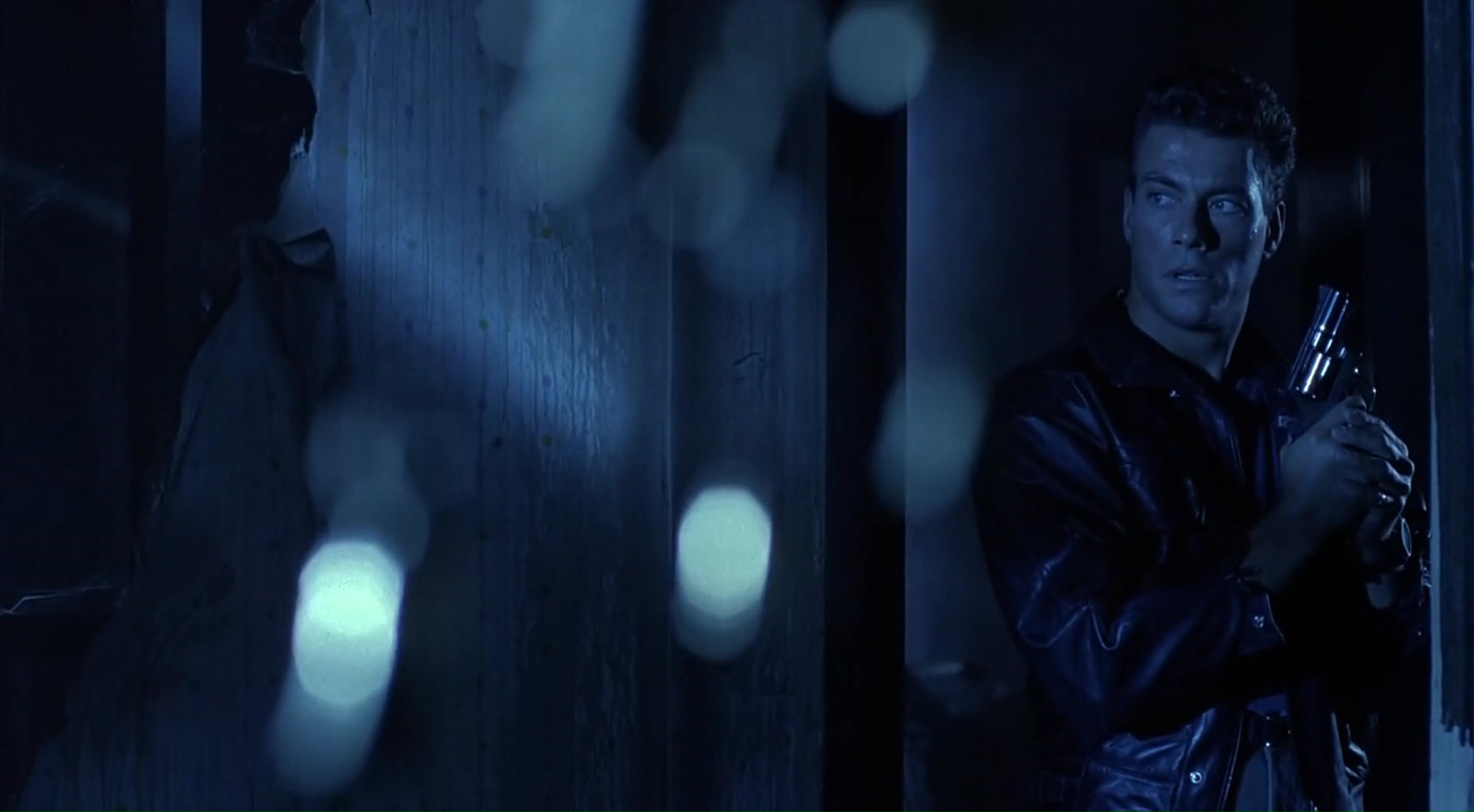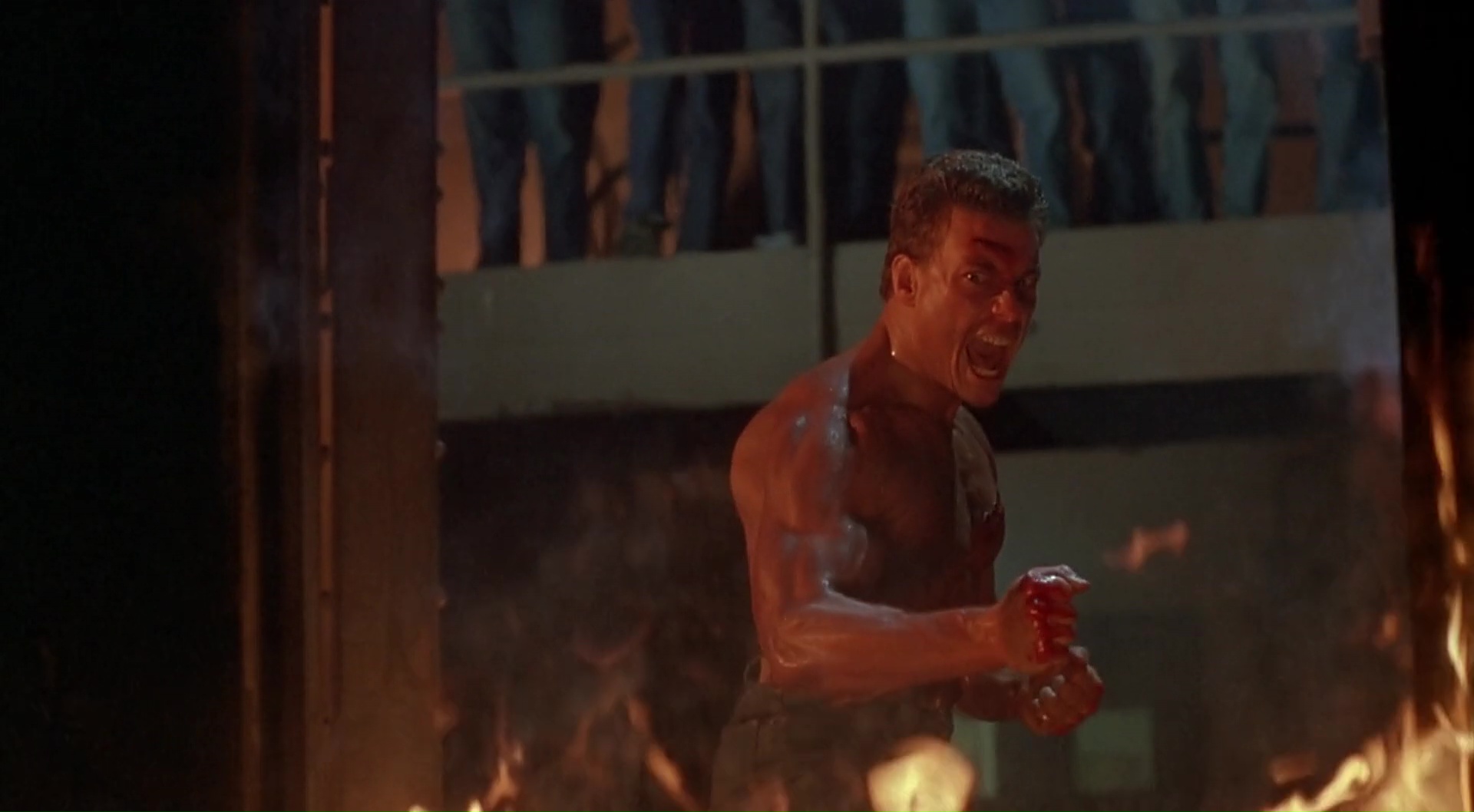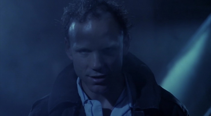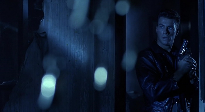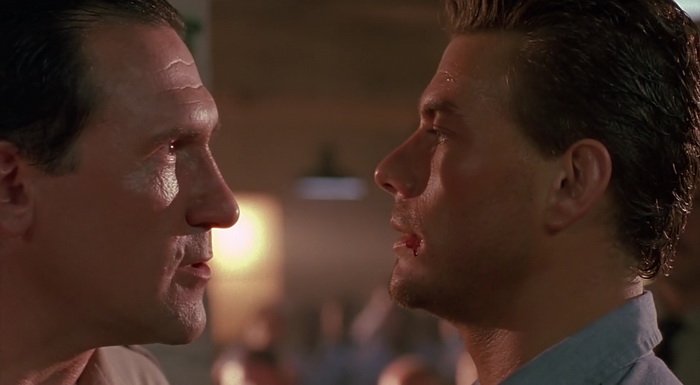 Coups pour Coups ne va pas réinventer la formule. Il n’en a jamais eu la prétention de toute façon. Il veut juste être divertissant et permettre à Jean-Claude de donner quelques coups de pieds retournés dans la face, ce qu’il fera, avec plaisir, et pas qu’une fois, dés qu’il en a l’occasion en fait. Tout en lui faisant subir tout ce que tout héros doit subir une fois en prison, y compris bien entendu le passage en isolement, tout nu avec ses muscles humides bien en valeur devant la caméra, et avec son éclairage bleuté typique de ses années là (et je l’aime bien moi cet éclairage bleuté). Mais Coups pour Coups livre un divertissement plutôt solide, même s’il flirte extrêmement souvent avec le nanar, comme notamment dans ce final, et tout simplement avec son méchant, introduit dés la scène d’ouverture, un tueur nommé le Sandman, surjoué par Patrick Kilpatrick (un gars qui a une gueule, et qui a souvent tendance à en faire trop, après tout, il avait commencé chez Troma avec Toxic Avenger). Un méchant qui en fait trop, et qui en plus, se relève toujours, peu importe les blessures. On pourra lui tirer dessus, le jeter dans les flammes, non, il se relèvera encore et toujours pour s’occuper de ce pauvre Jean-Claude. Au point que ça en devient très drôle par moment. Tout est over the top, tout est cliché et prévisible, mais il se dégage quelque chose du métrage, cette envie de bien faire de la part de l’équipe, qui est plutôt salvateur, même si la nostalgie et la découverte du film à l’époque doit clairement aider dans son appréciation aujourd’hui. Mais en soit, en le prenant pour ce qu’il est, c’est un petit divertissement sympathique.