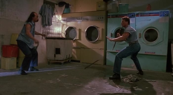 Rien de bien neuf, les flics qui s’infiltrent en prison, on en a déjà eu. Beaucoup, et Coups pour Coups ne va pas amener d’originalité. Encore récemment, Stallone et Schwarzenegger étaient tous les deux en prison dans Evasion, et même s’ils n’étaient pas flics, le concept était finalement relativement le même. Stallone y avait déjà fait un tour en 1989 d’ailleurs avec Haute Sécurité, et y refera un tour avec Kurt Russell, la même année, pour Tango et Cash, et là pour le coup, ils étaient deux, et tous les deux flics. Bref, Van Damme arrive en prison, et doit en quêter, et il comprend rapidement que les gangs sont séparés suivant les origines. C’est subtil oh oui. Et forcément, comme Van Damme c’est un flic et qu’il a un grand cœur, dés le premier jour, il veut défendre Hawkins (Robert Guillaume), et se met les latino à dos. Il pourra heureusement compter sur ses coups de pieds retournés, des détenus pas toujours doués, ainsi que deux ou trois clichés pour s’en sortir. Il devra d’ailleurs affronter à un moment Al Leong, tête inoubliable des seconds rôles de méchants dans le cinéma US de tout bords, puisqu’on l’aura vu dans Die Hard, Les Aventures de Jack Burton, L’Arme Fatale, Los Angeles 2013, Double Dragon, Le Flic de Beverly Hills 3, Last Action Hero, Rapid Fire, Dark Angel et j’en passe. Pas toujours crédité, mais toujours là quand il faut un méchant asiatique avec une vraie tête marquante. Au-delà de tout ça, Coups pour Coups accumule tous les clichés du genre. Les différents gangs, les prisonniers qui ont des faveurs de la part des gardiens, ceux qui peuvent vendre des renseignements ou même des femmes, des gardiens pas toujours tendres, le compagnon de cellule au départ méchant mais finalement plutôt sympathique, sans oublier le complot, les grands méchants cachés dans l’ombre depuis le début, la fille qui doit aider notre super flic et va succomber à ses charmes Belges, des meurtres très violents et un psychopathe qu’on envoie dans la même prison pour se débarrasser de ce brave Van Damme qui ne faisait que son travail.
