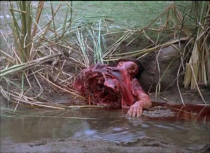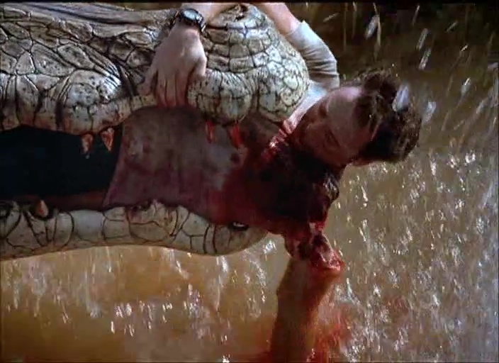 Oui, Crocodile 2 ne perd pas de temps, et on ne pourra pas lui reprocher ça, il se fait généreux. Puis une fois le crash amené et la plupart des passagers morts, plus qu’à reprendre le cours habituel de ce genre de productions, à savoir quelques truands, quelques survivants, et un crocodile géant de 10 mètres. On aura bien bébé croco au début mais deux chargeurs de Beretta dans la face et il ne fait plus vraiment le malin. C’est d’ailleurs pour ça que maman Croco va passer à l’attaque et traquer tous nos personnages. Le tagline des Dents de la Mer 4 le disait après tout : Cette fois-ci, c’est personnel ! Rien que ça. Malheureusement rapidement oui, on se retrouve vite dans une production NU Image tout ce qu’il y a de plus classique, avec des personnages cons, des incohérences, des facilités, des dialogues inutiles, et un croco. On sent la patte de Gary Jones d’ailleurs, qui dés qu’il le peut utilise des animatronics, pour les gros plans ou tout simplement les plans où la bête ne bouge pas trop. Et ça a immédiatement beaucoup plus de gueule que l’ensemble du premier métrage de Tobe Hooper.