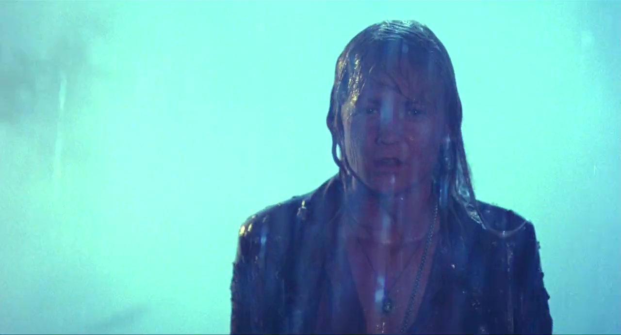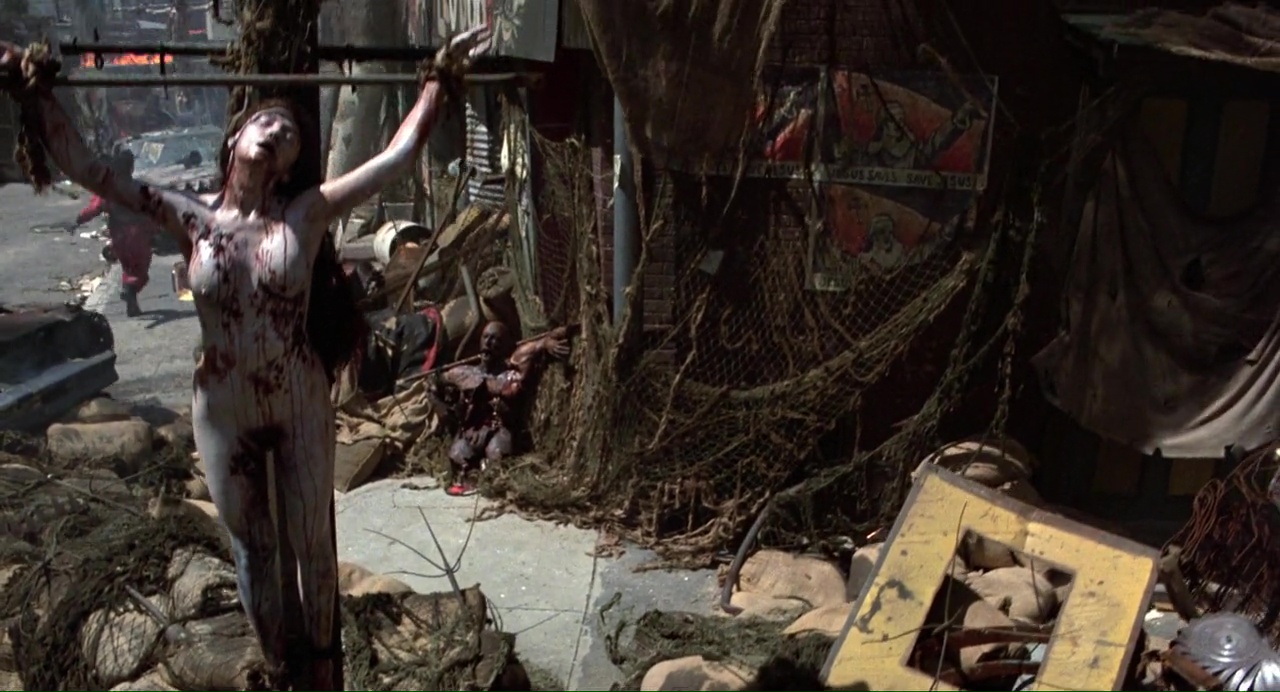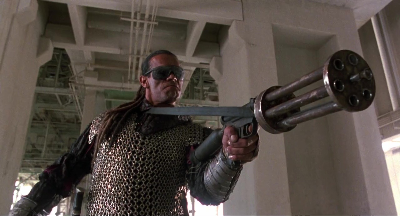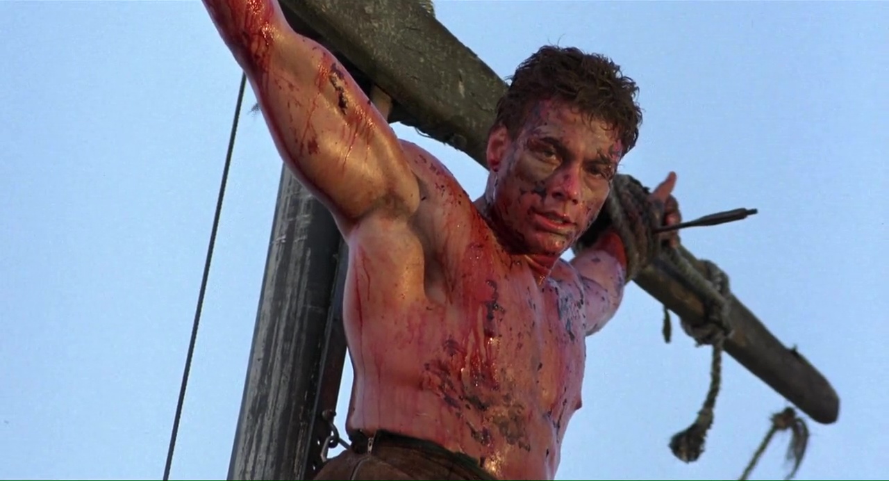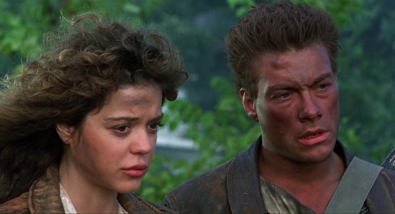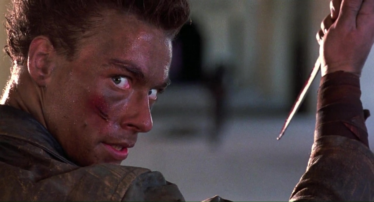 Ça démarre bien, pour peu que l’on aime les excès, avec ce plan de New York ravagé, la voix off bien grave du méchant qui cri « j’aime la misère, j’aime la mort », puis Van Damme qui bute du méchant à gogo, gratuitement, au couteau et tout. Ça a de la gueule, c’est même bien filmé, mais entre deux bastons, ça a beau être bien filmé, non, c’est chiant ! Alors oui, on a Van Damme qui refuse les avances d’une femme à poil, on a cette même femme à poil qui va courir sur la plage (la classe), on a des discussions, des méchants très méchants au regard bleu, un cyborg pas trop mal fichu, des flashback, une bonne ambiance visuelle et musicale (même si le même thème revient un peu trop souvent), et puis le temps parait long.