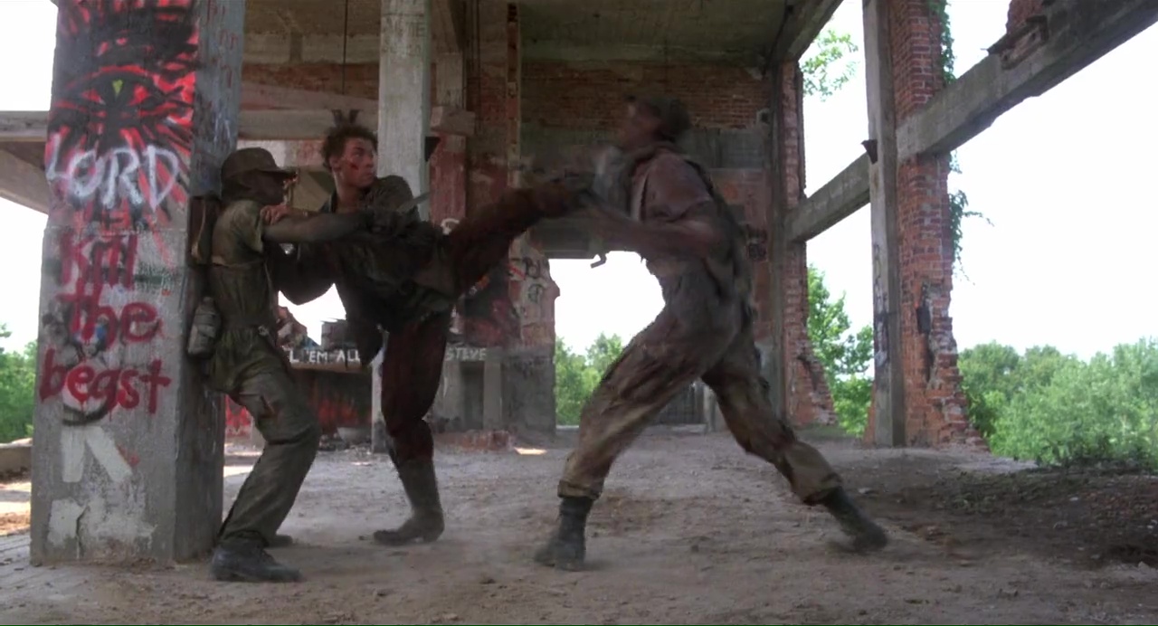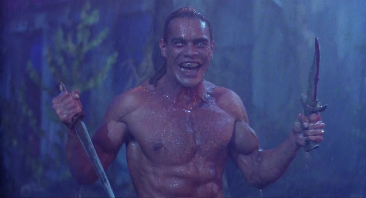 J’ai presque envie de dire qu’on aura quelques rapides bastons, mais que l’ensemble démarre au bout de 40 minutes, tout de même. Sur 1h26, ça fait tout de même… un peu… vous voyez quoi ! Quand ça se bouge enfin, avec la première vraie rencontre entre super méchant (Vincent Klyn, que l’on retrouvera dans Point Break en 1991) et super gentil (Van Damme donc) au bout de 40 minutes, même Albert Pyun semble plus motivé. Forcément, pour amener un final qui a de la gueule, Van Damme doit s’en prendre plein la gueule, le film ne surprend pas par sa structure, mais ça se fait beaucoup plus dynamique et plaisant. Bien entendu, il fera aussi son fameux grand écart, son coup de pied sauté retourné. Et Cyborg, c’est aussi un grand final, qui a clairement de la gueule, avec éclairage bleuté, pluie, coups de tatanes, et un méchant qui malheureusement va passer son temps à gueuler. Pour avancer, reculer, donner un coup, prendre un coup, regarder son ennemi, il criera. Jusque dans la mort il criera ! Cyborg vous avez compris, ce n’est pas du grand cinéma, ce n’est pas fameux tout court même si le métrage est bien emballé et comporte des bons moments. Mais son côté fauché se ressent par sa mauvaise gestion du rythme.
