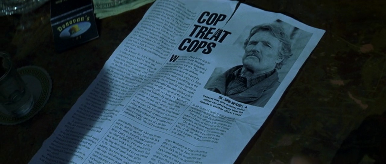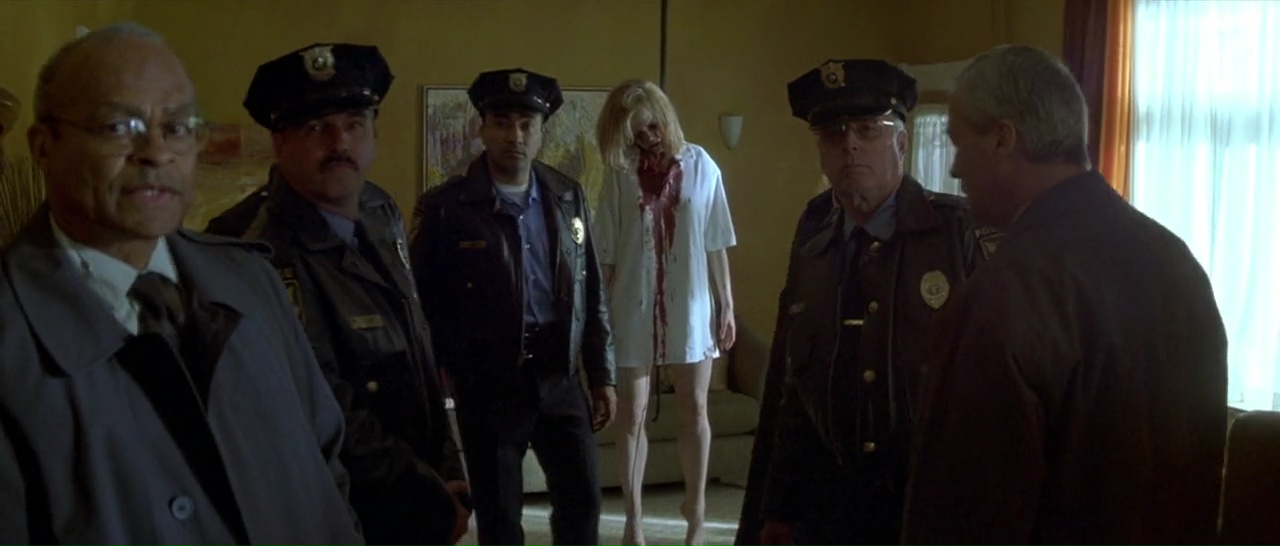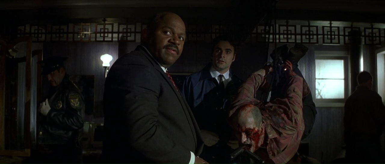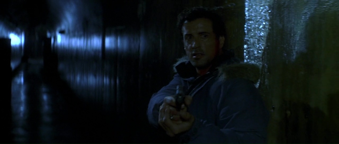 Stallone livre d’ailleurs une prestation tout à fait honnête, il « joue » véritablement et arrive à faire passer des émotions. Passé ce long prologue d’une vingtaine de minutes, le voilà envoyé par son ami flic (joué par Charles S. Dutton, vu dans Alien 3, Gothika, Fenêtre Secrète) dans un centre de désintoxication pour flics perdu au milieu de nulle part, et très rapidement surtout, pris en plein blizzard. Au départ, de nouvelles choses surprennent. Déjà, le casting. Et ben ils ont fait fort puisqu’il y a plus de têtes connues au mètre carré que dans une réunion d’anciens élèves. Outre Stallone et Dutton, on trouve donc Kris Kristofferson (la saga Blade, Payback), Christopher Fulford (Scoop), Jeffrey Wright (Casino Royale, Source Code, Broken Flowers), Tom Berenger (Platoon, Sniper), Stephen Lang (Avatar, Don’t Breathe), Robert Prosky (Last Action Hero, Gremlins 2) ou encore Robert Patrick (Terminator 2, Une Nuit en Enfer 2). Des têtes connues partout donc. Et là, le film change radicalement, empruntant beaucoup plus à un sous genre bien particulier de l’horreur, à savoir le slasher. À la différence que nous n’avons ici aucun adolescent mais bel et bien des adultes, des flics. Car petit à petit, les personnages vont tomber comme des mouches, le tueur de flics est toujours là, et en veut vraiment à Stallone.