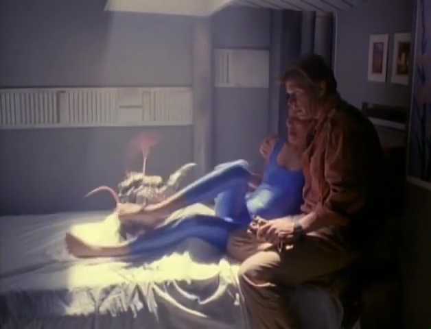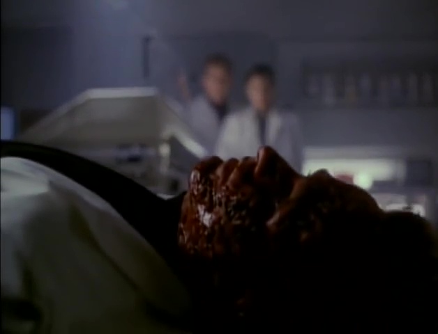Enfin, une bataille spatiale made in Corman, donc trois vaisseaux, quelques tirs bien mou dans l’espace, et c’est in ze Pocket quoi ! Dead Space oui, c’est fauché, après tout c’est une production Concorde, une pure production Corman, mais pourtant, si l’on est clairement d’humeur, on parvient à passer un plutôt bon moment, car Dead Space est un film généreux… Si on fait abstraction de son point de départ bien con (pour tuer un virus, on en créé un encore plus dangereux, youpi, bravo les scientifiques) et de quelques explications space dont de toute façon on se fiche complètement, Dead Space remplit son contrat. On a une méchante bestiole, avec des bras énormes, pleins de dents et tout, et elle bouffe tout le casting. Pas de CGI bien entendu, nous sommes chez Corman en 1991, mais du latex, de l’animation, des maquettes. Et ma foi, ça fait plaisir à voir. Côté casting, on navigue de curiosité en curiosité. Dans le rôle titre, on trouve Marc Singer, et on se dit malgré tout que la mini série V, c’était 10 ans avant. Le début des années 90 pour lui, ça fait mal, entre ça, Watchers 2 (toujours pour Corman), Dar L’Invincible 2 (j’aimais enfant !)…