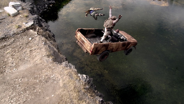 En fait, on a l’impression que le monteur n’avait pas assez d’images pour faire son travail correctement, et qu’il a lutté comme il a pu pour essayer de faire quelque chose qui avait un minimum de gueule. Mais raté ! L’ordre des concurrents change d’un plan à l’autre, l’helico qui survole la course en rase motte afin de filmer la scène (vu que le show est diffusé à travers le monde) disparait d’un plan à l’autre, puis réapparait comme par magie… C’est tout simplement une catastrophe.