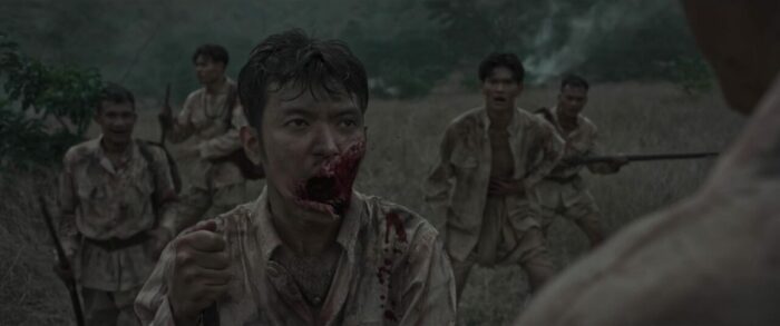Le reste de la famille elle semble vouloir aller de l’avant, avec la grande sœur prête à se marier, et le père refusant catégoriquement de parler des événements du premier film… sans les renier pour autant, passant ses nuits dans le salon, fusil de chasse à portée de main. Et donc, pour cette suite, 80% du temps, nous suivons Yak dans sa quête de vengeance, tout en apprenant quelques informations de plus sur l’esprit en question. Et dès la scène d’ouverture, le film affiche son ambition de faire dans la démesure, avec ce flashback en pleine guerre qui se termine par l’apparition de l’esprit, un pacte, et le massacre de tout un tas de soldats, avec corps explosés, tranchés et j’en passe. Et lorsque l’on retrouve enfin Yak, c’est pour le voir faire face à un esprit, et ne pas hésiter un seul instant à utiliser la force pour obtenir les informations qu’il souhaite, allant jusqu’à mentir à l’esprit par la suite (oui, la promesse du pardon et de la réincarnation, il s’en fou lui). Une ouverture qui tranche un peu avec le précédent volet qui lui misait énormément sur l’ambiance. Le gore reste présent, on suit bien la suite de la même histoire, mais l’orientation est plus musclée. Lorsque Yak apprend donc la possible cachette de sa cible, il s’y rend, accompagné d’un autre groupe de personnages destinés à mourir, et tout cela permet au métrage de multiplier les morts déjà, mais aussi de varier les menaces, puisque l’esprit du premier film n’est plus le seul à être en avant, et donc, que le danger est multiple pour les personnages. Et au final, si l’on fait abstraction de quelques mauvais CGI donnant un aspect peu naturel à certains éléments, au final, Death Whisperer 2 est une honnête suite.