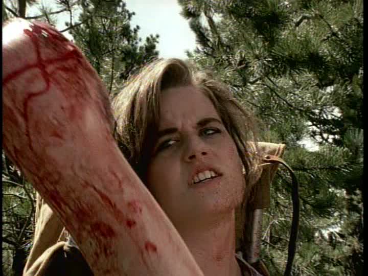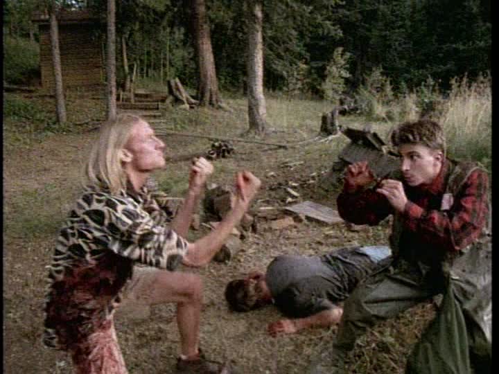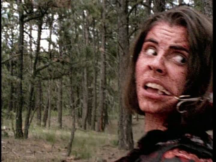 Ceux qui sont allergiques à cet humour d’un niveau très bas il faut bien avouer risquent de s’ennuyer ferme et de ne pas arriver à la fin du métrage. Tirant son inspiration dans les slashers les plus connus, comme Vendredi 13, et parfois même dans d’autres œuvres cultes du cinéma de genre (Evil Dead, La Nuit des Morts Vivants), Decampitated tourne l’ensemble à la dérision. Un groupe de jeunes qui n’y connait rien et dont les membres sont un peu attardés se retrouve perdus en forêt à la recherche d’un camp maudit, et oh surprise, un tueur est après eux. Mais là, face à la débilité des différents personnages, notre tueur aura encore plus de mal à venir à bout de ses victimes, si bien que la plupart des morts seront plus des accidents qu’autre chose. Pourtant, il redouble d’inventivité dans ses armes, avec outre la classique machette, la canne à pêche, le robinet (oui oui !), le fil de barbelé, et j’en passe. Et pourtant, dans cette ambiance très cartonnesque (bruitages à l’appui constamment), nos personnages ne veulent pas mourir. Une gorge tranchée et il suffira d’un peu de sparadrap pour que l’aventure continue. Un bras tranché ici pourra toujours servir d’arme pour frapper le tueur et le ralentir. Pour peu que l’on connaisse ses classiques sur le bout des doigts, les références sont nombreuses et savoureuses, le sang gicle à gogo, et on se demande bien quand tout cela va finir et surtout comment.