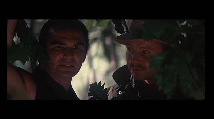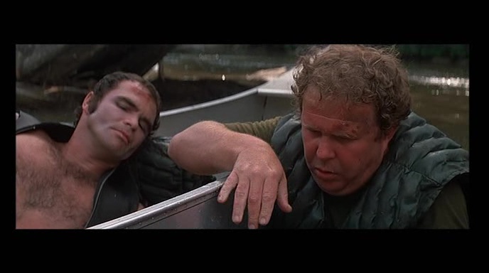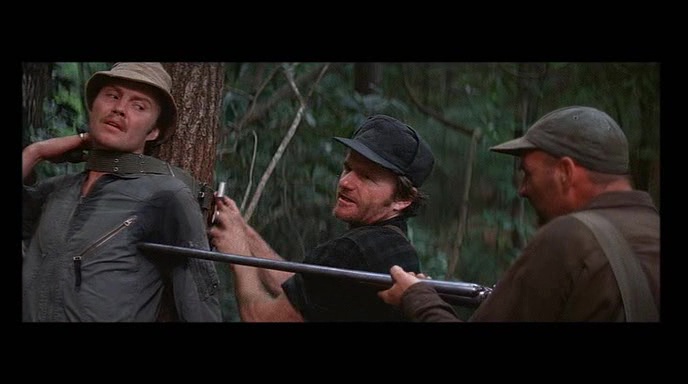 Un peu à la manière de ces survival cannibales qui sortiront à la fin des années 70 et dans les années 80 en Italie, Délivrance nous montre au départ juste quatre personnages, comme vous et moi, qui se lancent un défi, en explorant une zone relativement inexplorée de la nature. Avec ce que cela comporte bien entendu de retour à la nature, puisque nos personnages sont seuls, et n’ont pas de matériel leur permettant de surmonter les différentes épreuves se présentant à eux. Et si le métrage s’amuse avec certains clichés, il délaisse tout simplement les autres. Oui, ici, pas de fille sexy qui se dénudera, mais que des hommes. Pas non plus de noir à faire périr en premier et vite pour l’effet choc, rien de tout ça. Burt Reynolds joue un mec sûr de lui, qui assure, mais pour seule arme, il aura un arc. Et outre la nature, face à eux, les locaux, plus renfermés sur eux-mêmes, et n’aimant pas voir des étrangers tenter d’être intrusif dans leur environnement. Comment ne pas penser à Les Chiens de Paille de Peckinpah justement, film qu’il réalisa après avoir vu les droits de Délivrance lui passer sous le nez ? Mais comme dans tout survival, il faut s’adapter pour survivre.