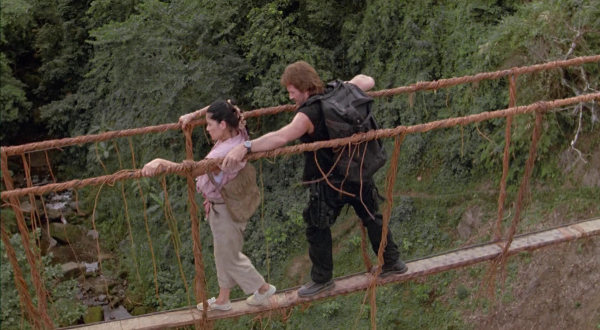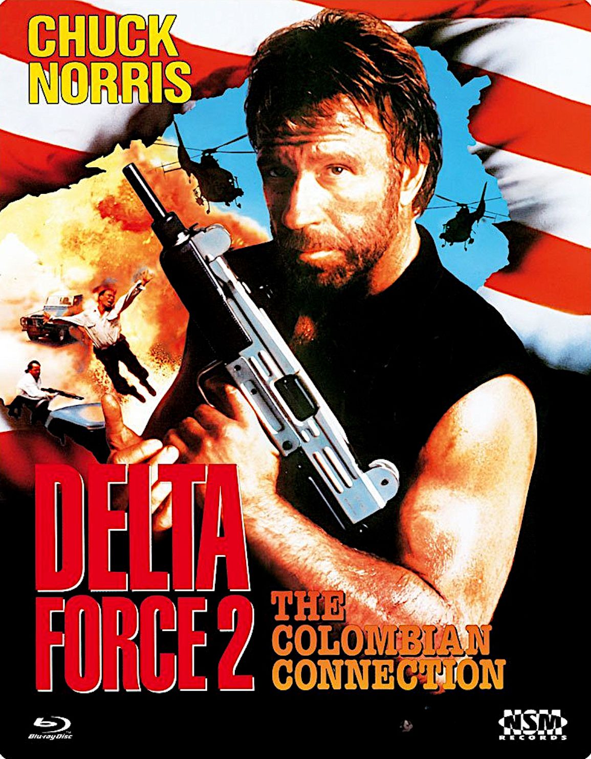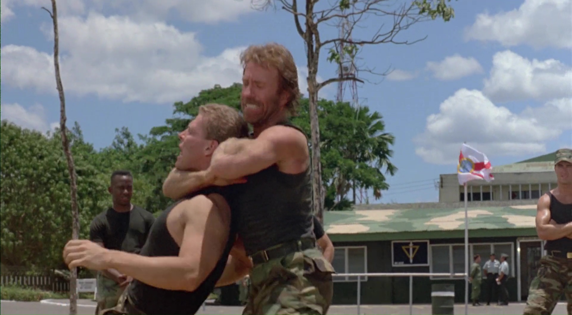 Pour aller fouiner dans la fin du catalogue de la Cannon, c’est que mine de rien je devais être sacrément en manque de Chuck Norris. Car Delta Force 2 date de 1990, soit les toutes dernières années de la Cannon, qui a essuyée échec sur échec depuis 1985. Les budgets montent, mais les recettes diminuent. Du coup, la Cannon décide de donner des suites à certains de leurs succès, ou à des licences qu’ils récupèrent. Superman IV en 1987, Le Justicier Braque les Dealers en 1987 également, Portés Disparus 3 en 1988, et ce Delta Force 2 en 1990, rapidement suivi par une suite l’année suivante, mais sans Chuck Norris ce coup-ci. Seulement au début des années 90, tout faire exploser à l’écran, ça coûte cher, et Delta Force 2 se retrouve donc avec un budget estimé à 16 millions de dollars. Il n’en rapportera que 8 sur le sol Américain. Le projet Delta Force 2, il est lancé dés 1988. Chuck annonce d’ailleurs en fin d’année que le script a des soucis et subit des réécritures. Un rôle est proposé à Jean Claude Van Damme mais le monsieur préfère le projet Cyborg (sic !) pour Albert Pyun. Après avoir gagné le Vietnam tout seul et trois fois, après avoir vaincu les Russes, puis les Palestiniens, Chuck va devoir se frotter aux Colombiens ! Enfin, dans les faits, puisqu’en guise de grand méchant, c’est Billy Drago qui s’y colle. Mais après tout, Robert Forster dans le premier Delta Force était aussi Palestinien que Drago est Colombien. Un détail donc. Sauf que le tournage lui a lieu aux Philippines. Pas grave ils ont du se dire, une forêt est une forêt. Sauf que la plupart des figurants, et on peut le dire, Chuck et son équipe vont en buter un bon paquet, et bien, ils sont Philippins. Un gros détail, mais un détail tout de même a du se dire la Cannon Films. Moi en tout cas, ça m’aura bien fait rire, tant il n’y a absolument rien de Colombien dans ce film où le Delta Force est envoyé en mission en Colombie pour démanteler un trafic de drogue et ramener au bercail un trafiquant.