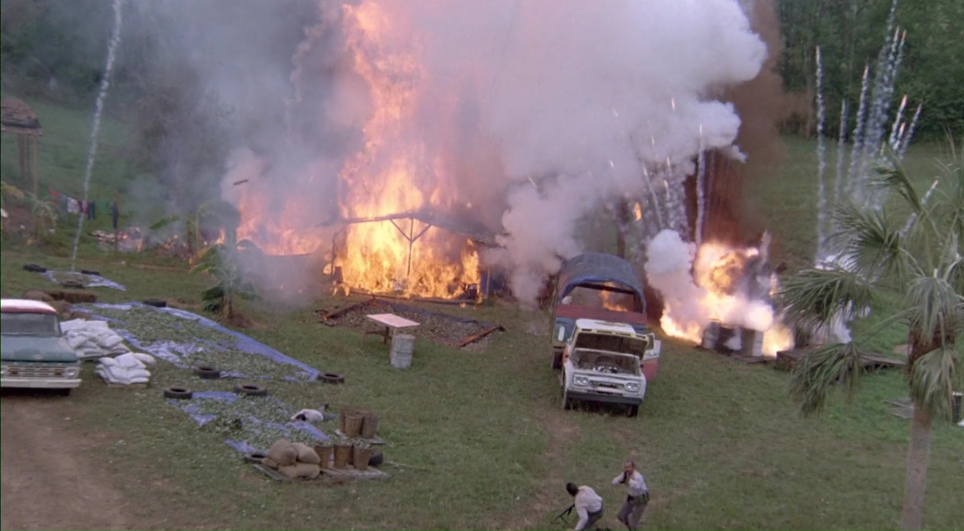 Et dans le fond, le film, scénaristiquement parlant en tout cas, fait tout pour que l’on se moque de lui. Un peu à la manière de Invasion U.S.A., sauf que le film de Zito avait une certaine insouciance, une envie d’être généreux et du coup, tout allait tellement vite que l’on en riait sans trop se poser de questions. Mais là, c’est Delta Force 2, est le rythme est plutôt lent pendant toute la première heure, à l’image du premier film. Du coup tous les détails, tous les défauts, tous ces moments risibles, ils sautent aux yeux. S’il n’y avait que ses Philippins essayant de se faire passer pour des Colombiens, mais non, c’est tout le film qui est ainsi. On pourra citer cette arrestation dans un avion très tôt dans le film, avant parachutage express pour retourner au pays. Ou encore le fait que Chuck et les relations internationales, il s’en fou totalement, amenant aux Philippines… euh en Colombie je veux dire des armes à peine camouflées dans un hélicoptère. Hélicoptère qui en un instant devient une bête de guerre, avec mitrailleuses de tous les côtés, et surtout, ces lances roquettes sur les deux côtés, à munitions illimitées bien entendu, cela va de soit. L’on pourrait également parler de ces paysans, qui travaillent dans les champs pour récolter de la drogue, mais ne sont pas contents (en réalité, même s’ils n’aiment pas ça, il s’agît de leur source de revenue et ne vont donc pas toujours faire la fine bouche). Ce qui permet au bad guy de service de montrer qu’il est très méchant, en exécutant des bébés, des maris, et en violant des femmes, qui deviennent alors des agents infiltrés pour aider Chuck dans sa mission. C’est d’ailleurs assez rare pour le souligner, mais ce personnage féminin, subtilement écrit (hmm hmm) a au moins le mérite de servir, et ce durant la majeure partie du métrage, montrant une constante dans l’écriture du film, ce qui est, oui, rare. Et pour bien rire, n’oublions pas l’entraînement que fait subir Chuck à ses recrues.