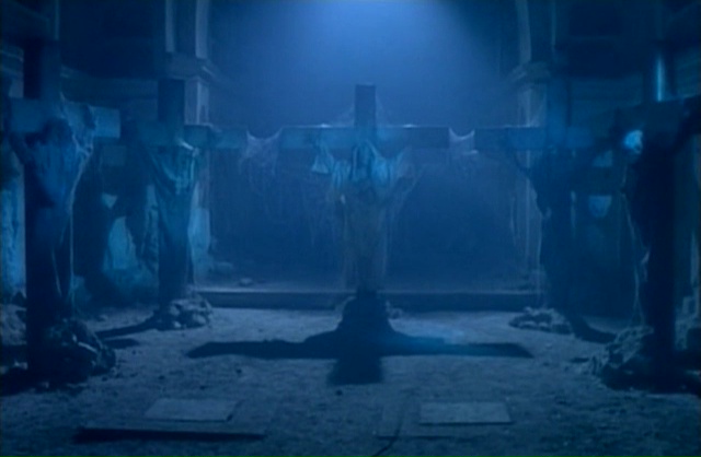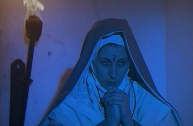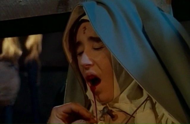 Cela faisait bien longtemps que je n’avais pas vu un film de Lucio Fulci (car oui, Perversion Story, je l’ai vu il y a un an en vrai, et écrit dessus il y a un an, chut !). Il faut dire que j’ai vu depuis des années la plupart de ses grands films (dans des genres divers), et que l’exploration de sa carrière passé L’Éventreur de New York en 1982 n’était pas glorieuse. Simple d’ailleurs, dés 1982 avec La Malédiction du Pharaon, ce n’était plus ça, tant le film était chiant. Puis Fulci traversa pendant quelques années le désert avec des films clairement nuls (Conquest, Les Mercenaires du Futur) avant de tenter de revenir au giallo (en 1984 avec le mauvais Murder Rock) puis au film d’horreur (en 1987 avec le mauvais Aenigma). La suite de sa carrière se poursuivra dans le cinéma d’horreur, sans qu’il ne retrouve jamais la folie qui l’animait dans les années 70 et au tout début des années 80. Soupçons de Mort, Les Fantômes de Sodome, Zombi 3, Nightmare Concert, Voix Profondes. Tout ça, ce n’est pas très bon. Dans le lot, il n’y avait bien que House of Clocks (La Casa Nel Tempo) qui parvenait à être sympathique. Du coup, Demonia, datant de 1990, entre un Nightmare Concert et un Voix Profondes, ça ne faisait pas envie. Mais comme j’avais le dvd zone 1 depuis des années, il faut parfois se motiver un peu. Seulement 1h25 au compteur, et c’est parti. Verdict au bout du compte ? Ben ce n’est pas très bon, mais on est très loin de certaines catastrophes précédentes de Fulci malgré tout. On sent clairement, du début à la fin, qu’il tente de revenir aux films qui furent sa gloire. Oui, dés sa scène d’ouverture en 1484 ou des nonnes sont crucifiées, on pense à la scène d’ouverture de L’Au-Delà avec son peintre crucifié. Puis lorsque l’instant suivant nous découvrons notre personnage principal, joué par Meg Register, qui voit les événements lors d’une séquence de spiritisme, comment ne pas penser à la présentation du personnage de Catriona MacColl dans Frayeurs.
