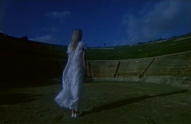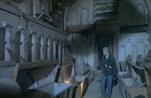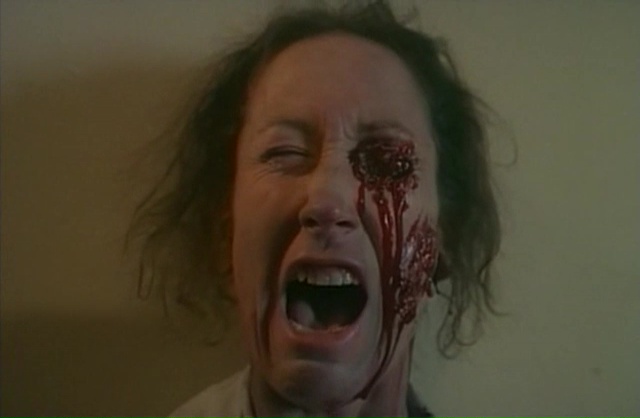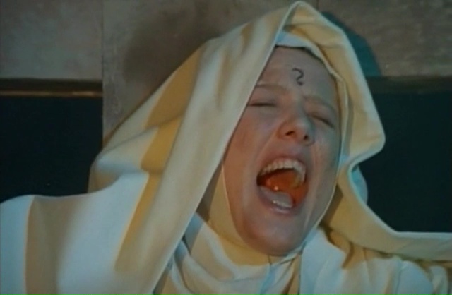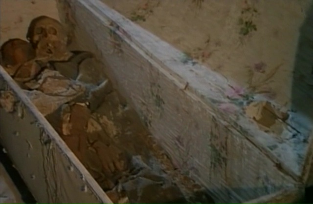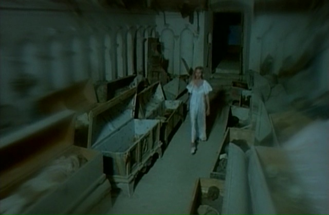 Fulci parsème clairement son scénario de moments ramenant à des films précédents de son œuvre, sans jamais parvenir à atteindre la même portée. Fainéantise ? Désir de faire plaisir à son fan ? Peut-être un peu des deux. Et étrangement, Demonia navigue justement sans arrêt entre le moment qui nous rappellera le bon vieux temps de bonne manière, les moments proprement ratés et mal venus, et quelques moments clairement maîtrisés qui viennent relever indéniablement le niveau général du film. Bancal, ça l’est par contre, aucun doute à ce sujet. Du coup, faisons simple, dans Demonia, notre super héroïne pas très intelligente et n’ayant pas un seul instant le charisme de Catriona MccColl va venir foutre la merde en cassant un mur et en libérant les esprits des nonnes tuées 5 siècles plus tôt. Qui vont bien entendu venir hanter le village et tuer les habitants, sinon ce ne serait pas amusant. En terme d’histoire donc, c’est du classique et du cliché en pagaille, mais on sait depuis le temps que niveau scénario, Fulci n’a jamais été excellent. Sur le papier, Frayeurs et l’Au-Delà ne sont d’ailleurs pas bon, mais c’est grâce à leur ambiance macabre qu’ils trouvent étrangement leurs qualités. Demonia tente d’ailleurs de jouer également dans cette cours là. Avec plus ou moins de succès, car un bon paquet de scènes fonctionnent. Lorsque Lisa va explorer les catacombes, découvrir des ruines, trouver les corps des nonnes, ça fonctionne, la mise en scène est du pur Fulci (oui vous allez en bouffer du zoom sur les yeux), la photographie malgré quelques faux raccords est très agréable pour les yeux et offre de très belles images. Si en plus, on rajoute quelques scènes oniriques qui fonctionnent plutôt biens, on se dit que c’est du tout bon. Et on le sait depuis le temps, mais quand Fulci doit filmer des morts, il ne fait pas semblant.